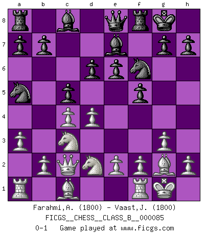 Last move : 0-1 2009 December 1 9:10:52 [Event "FICGS__CHESS__CLASS_B__000085"] [Site "FICGS"] [Date "2009.09.09"] [Round "1"] [White "Farahmi,Andi"] [Black "Vaast,Jean-Philippe"] [Result "0-1"] [WhiteElo "1800"] [BlackElo "1800"] 1.d4 f5 2.g3 e6 3.Bg2 Nf6 4.Nf3 Be7 5.O-O O-O 6.c4 d6 7.Nc3 Qe8 8.Qc2 Nc6 9.a3 Na5 10.Nd2 c5 0-1 This chess game has been lost on time (started : 2009.09.09 8:43:55) Dutch defense Kingside Castling by player White (move 5) Kingside Castling by player Black (move 5) Player Black won this chess game. Follow this game move after move (download)The sign of a great Master is his ability to win a won game quickly and painlessly. (Irving Chernev) Im Wettkampf zwischen starken Meistern kommen Fehler sehr selten vor, deshalb ist es mit bloßem Warten nicht getan. (José Raúl Capablanca) Un sacrificio se refuta mucho mejor al aceptarlo. (Wilhelm Steinitz) Toute estimation doit être constamment réévaluée. (Jacob Estrin) God is an atheist. (Unknown)