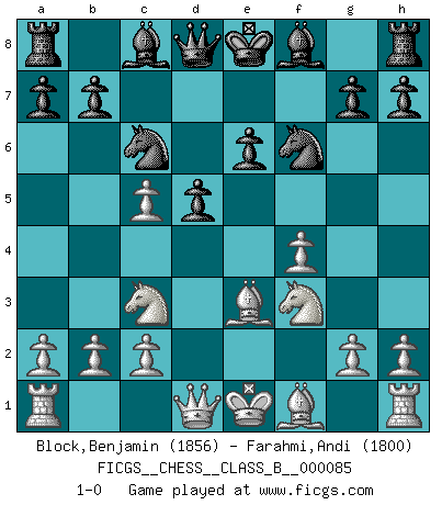 Last move : 1-0 2009 December 6 21:19:3 [Event "FICGS__CHESS__CLASS_B__000085"] [Site "FICGS"] [Date "2009.09.09"] [Round "1"] [White "Block,Benjamin"] [Black "Farahmi,Andi"] [Result "1-0"] [WhiteElo "1856"] [BlackElo "1800"] 1.e4 e6 2.d4 d5 3.Nc3 Nf6 4.e5 Nfd7 5.f4 c5 6.Nf3 Nc6 7.Be3 f6 8.exf6 Nxf6 9.dxc5 1-0 This chess game has been lost on time (started : 2009.09.09 8:43:55) French : Steinitz, Boleslavsky variation Player White won this chess game. Follow this game move after move (download)There are two classes of men; those who are content to yield to circumstances and who play whist; those who aim to control circumstances, and who play Chess. (Mortimer Collins) Strategie ist, wie man ein Mädchen auf den Rücksitz bekommt. Taktik ist, was man tut, wenn man dann dort ist. (Anonymous) Una buena memoria, concentración, imaginación y una fuerte voluntad, se requiere para llegar a ser un buen jugador. (Bobby Fischer) Les sacrifices démontrent seulement que quelqu'un a gaffé. (Savielly Tartacover) If you ain't just a little scared when you enter a casino, you are either very rich or you haven't studied the games enough. (Pappy)