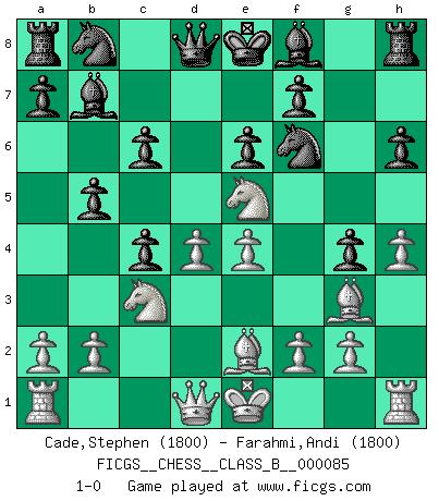 Last move : 1-0 2009 December 1 9:10:52 [Event "FICGS__CHESS__CLASS_B__000085"] [Site "FICGS"] [Date "2009.09.09"] [Round "1"] [White "Cade,Stephen"] [Black "Farahmi,Andi"] [Result "1-0"] [WhiteElo "1800"] [BlackElo "1800"] 1.d4 d5 2.c4 c6 3.Nf3 Nf6 4.Nc3 e6 5.Bg5 h6 6.Bh4 dxc4 7.e4 g5 8.Bg3 b5 9.Be2 Bb7 10.h4 g4 11.Ne5 1-0 This chess game has been lost on time (started : 2009.09.09 8:43:55) QGD Slav : 4.Nc3 Player White won this chess game. Follow this game move after move (download)It's always better to sacrifice your opponent's men. (Savielly Tartakover) Später, ... hatte ich zunehmend Erfolg in entscheidenden Partien. Vielleicht weil ich eine einfache Wahrheit erkannte: nicht nur ich hatte Angst, auch mein Gegner. (Mikhail Nekhemyevich Tal) Tu puedes aprender mucho mas de una partida que pierdas que de una partida ganada. Tendras que perder cientos de partidas antes de llegar a ser un buen jugador. (Jose Raul Capablanca) Mais l'homme est une créature légère et illogique : semblable au joueur d'échecs, il n'aime que le processus du but à atteindre, non le but lui-même. (Dostoïevsky) Waiting for chance ? Play in casinos. (FICGS proverb)