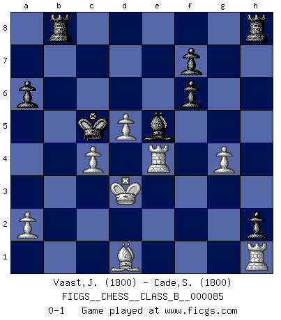 Last move : 0-1 2009 September 29 11:7:38 [Event "FICGS__CHESS__CLASS_B__000085"] [Site "FICGS"] [Date "2009.09.09"] [Round "1"] [White "Vaast,Jean-Philippe"] [Black "Cade,Stephen"] [Result "0-1"] [WhiteElo "1800"] [BlackElo "1800"] 1.e4 c5 2.Nf3 d6 3.d4 cxd4 4.Nxd4 Nf6 5.Nc3 a6 6.Bg5 e6 7.f4 Qb6 8.Qd2 Nc6 9.Bxf6 gxf6 10.O-O-O Qxd4 11.Qxd4 Nxd4 12.Rxd4 Bd7 13.Be2 h5 14.Rhd1 Bc6 15.g3 h4 16.g4 Bh6 17.Rf1 e5 18.Rxd6 Ke7 19.Rd3 Bxf4+ 20.Kb1 Bxh2 21.Nd5+ Bxd5 22.exd5 e4 23.Re3 Be5 24.Rh1 Kd6 25.c4 Rag8 26.b3 b5 27.Bd1 bxc4 28.bxc4 Kc5 29.Rxe4 h3 30.Kc2 h2 31.Kd3 Rb8 0-1 Sicilian : Najdorf, 7...Qb6 Queenside Castling by player White (move 10) Player Black won this chess game. Follow this game move after move (download)The older I grow, the more I value Pawns. (Keres) Wenn ich einen Club besuche, sind die Spieler stumm vor Staunen. (José Raúl Capablanca) Morphy probablemente fue el genio más grande de todos. (Bobby Fischer) Le jeu d'échecs est comme rejeté hors du temps. (Antoine de Saint-Exupéry) For to win one hundred victories in one hundred battles is not the acme of skill. To subdue the enemy without fighting is the acme of skill. (Sun Tzu)