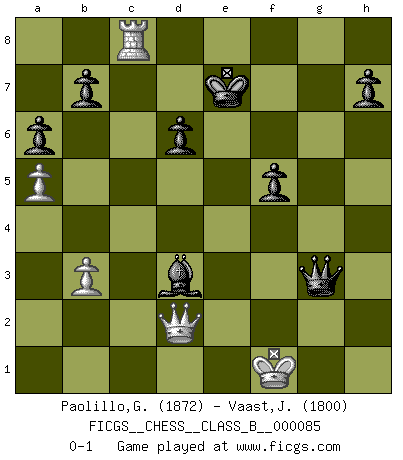 Last move : 0-1 2010 March 30 22:14:33 [Event "FICGS__CHESS__CLASS_B__000085"] [Site "FICGS"] [Date "2009.09.09"] [Round "1"] [White "Paolillo,Giampiero"] [Black "Vaast,Jean-Philippe"] [Result "0-1"] [WhiteElo "1872"] [BlackElo "1800"] 1.e4 c5 2.Nc3 Nc6 3.f4 e6 4.Nf3 Nf6 5.Bb5 Be7 6.e5 Nd5 7.Nxd5 exd5 8.O-O O-O 9.d4 cxd4 10.f5 f6 11.exf6 Bxf6 12.Bd3 d6 13.Bf4 Nb4 14.a3 Nxd3 15.Qxd3 Qb6 16.a4 Bd7 17.Ra3 Rac8 18.Rb3 Qa6 19.a5 Rc4 20.Ng5 Bb5 21.Qe2 Bxg5 22.Bxg5 Rf7 23.Qf2 Qc6 24.Rc1 Ba4 25.Rg3 Bxc2 26.f6 Bg6 27.Rxc4 Qxc4 28.Qe1 gxf6 29.Bh6 Qc8 30.h4 Kh8 31.Qf2 a6 32.Rf3 Qe6 33.Qxd4 Be4 34.Rf2 Kg8 35.Qb6 Rd7 36.Qe3 f5 37.Rc2 Qg6 38.Rc8+ Kf7 39.Qd2 Qg4 40.Qf2 d4 41.Qd2 d3 42.b3 Re7 43.Bg5 Bxg2 44.Bxe7 Be4 45.Kh2 Kxe7 46.Qf2 d2 47.Qxd2 Qxh4+ 48.Kg1 Qg3+ 49.Kf1 Bd3+ 0-1 Sicilian : Grand Prix attack Kingside Castling by player White (move 8) Kingside Castling by player Black (move 8) Player Black won this chess game. Follow this game move after move (download)All Chess players should have a hobby. (Savielly Tartakower) Wie bekannt hörte Morphy 1859 auf, Schach zu spielen. Seine Enttäuschung galt nicht so sehr dem Schach, wie den Schachspielern. (Robert James Fischer) El Ajedrez no es como la vida... ¡tiene reglas!. (Mark Pasternak) La conception d'un plan est le processus par lequel un joueur exploite les avantages de sa position tout en s'efforçant d'en réduire au minimum les inconvénients. Afin de garantir le succès, un plan doit toujours se fonder sur un diagnostic objectif des particularités d'une position. La conception d'un plan est d'autant plus difficile que la position est équilibrée, et grandement facilitée lorsqu'il n'existe qu'un seul plan susceptible de répondre aux exigences de la position. (Harry Golombek) If only faces could talk... (Pat Summerall, Sportscaster during the Super Bowl)