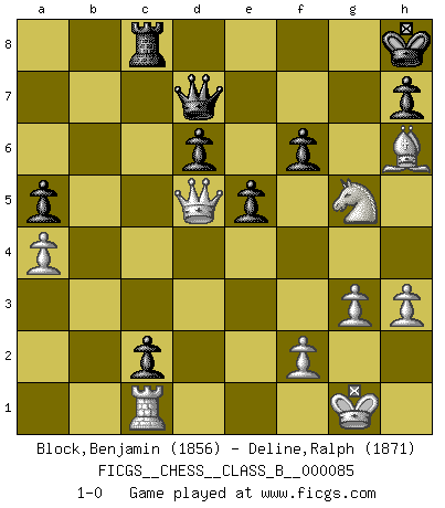Last move : 1-0 2010 March 6 21:51:56 [Event "FICGS__CHESS__CLASS_B__000085"] [Site "FICGS"] [Date "2009.09.09"] [Round "1"] [White "Block,Benjamin"] [Black "Deline,Ralph"] [Result "1-0"] [WhiteElo "1856"] [BlackElo "1871"] 1.d4 Nf6 2.Nf3 g6 3.c4 Bg7 4.g3 O-O 5.Bg2 c5 6.d5 Qa5+ 7.Bd2 Qa6 8.Qc2 d6 9.O-O b5 10.cxb5 Qxb5 11.Nc3 Qb6 12.e4 Na6 13.a3 Rb8 14.Rab1 Bd7 15.Be3 Nc7 16.h3 Nb5 17.Ne2 Rfc8 18.Qd3 Nc7 19.Nc3 Nxe4 20.Qxe4 Bf5 21.Qc4 Bxc3 22.Qxc3 Nxd5 23.Qd2 Bxb1 24.Rxb1 e6 25.Bh6 c4 26.Qc2 c3 27.b3 Qa5 28.Bc1 Nb6 29.Ra1 e5 30.b4 Qb5 31.Bh6 a5 32.Bf1 Qc6 33.Be2 Nd5 34.b5 Rxb5 35.Bxb5 Qxb5 36.Rb1 Qc6 37.Ng5 Ne7 38.Ne4 Nd5 39.Qb3 c2 40.Rc1 Kh8 41.a4 g5 42.Qf3 Qd7 43.Nxg5 f6 44.Qxd5 1-0 King's Indian : East Indian defense Kingside Castling by player Black (move 4) Kingside Castling by player White (move 9) Player White won this chess game. Follow this game move after move (download)Not only will I predict his triumph over Botvinnik, but I'll go further and say that he'll probably be the greatest Chess player that ever lived. (John Collins) Spiel ein langweiliges Spiel zu Ende und lustige Dinge können passieren. (Hans Ree) ¿Que sería del Ajedrez sin errores graciosos?. (Kurt Richter) Que feriez-vous si vous étiez en train de jouer aux échecs et que la fin du monde arrive ? Je continuerais à jouer. (Saint Borromée) Statistics can be made to prove anything - even the truth. (Author unknown)