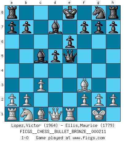 Last move : 1-0 2009 September 10 2:0:23 [Event "FICGS__CHESS__BULLET_BRONZE__000211"] [Site "FICGS"] [Date "2009.09.10"] [Round "1"] [White "Lopez,Victor"] [Black "Ellis,Maurice"] [Result "1-0"] [WhiteElo "1964"] [BlackElo "1779"] 1.e4 e6 2.d4 d5 3.e5 c5 4.c3 Nc6 5.Nf3 Bd7 6.Be2 Qb6 7.dxc5 Bxc5 8.O-O Qc7 9.Re1 Nxe5 10.Nxe5 Qxe5 11.Bf3 1-0 French : Advance, Euwe variation Kingside Castling by player White (move 8) Player White won this chess game. Follow this game move after move (download)Only the player with the initiative has the right to attack. (Wilhelm Steinitz) Das Schachspiel übertrifft alle anderen Spiele so weit wie der Chimborasso einen Misthaufen. (Arthur Schopenhauer) La táctica fluye a partir de una posición superior. (Bobby Fischer) Lorsque vous vous retrouvez devant une position atroce, ne tendez pas un ultime piège dérisoire avec l'intention d'abandonner si l'adversaire le déjoue ! Faites-vous plutôt un devoir de résister comme si votre vie en dépendait. Jouez le coup qui vous déplairait au centuple si vous étiez dans la peau de votre tortionnaire ! If you work for a living, why do you kill yourself working ? (Tuco to a chicken in The Good, The Bad and The Ugly)