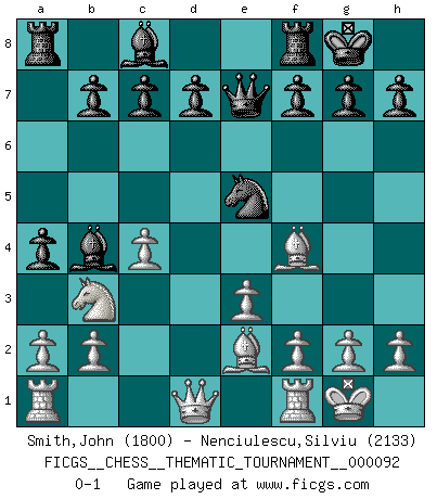 Last move : 0-1 2010 January 14 20:17:22 [Event "FICGS__CHESS__THEMATIC_TOURNAMENT__000092"] [Site "FICGS"] [Date "2009.09.10"] [Round "1"] [White "Smith,John"] [Black "Nenciulescu,Silviu"] [Result "0-1"] [WhiteElo "1800"] [BlackElo "2133"] 1.d4 Nf6 2.c4 e5 3.dxe5 Ng4 4.Bf4 Nc6 5.Nf3 Bb4+ 6.Nbd2 Qe7 7.e3 Ngxe5 8.Nxe5 Nxe5 9.Be2 O-O 10.O-O a5 11.Nb3 a4 0-1 Budapest : Rubinstein variation Kingside Castling by player Black (move 9) Kingside Castling by player White (move 10) Player Black won this chess game. Follow this game move after move (download)I like to say that Bobby Fischer was the greatest player ever. But what made Fischer a genius was his ability to blend an American freshness and pragmatism with Russian ideas about strategy. (Bruce Pandolfini) Jeder Schachmeister war einmal ein Anfänger. (Irving Chernev) Todos los Maestros de Ajedrez fueron un día unos principiantes. (Chernev) Psychologiquement, tu dois avoir confiance en toi même, mais cette confiance doit être basée sur des faits. (Robert Fischer) I can't decide which is riskier; taking crazy risks, or taking advice on crazy risks from a crazy risk taker. (Gregory House in House M.D.)