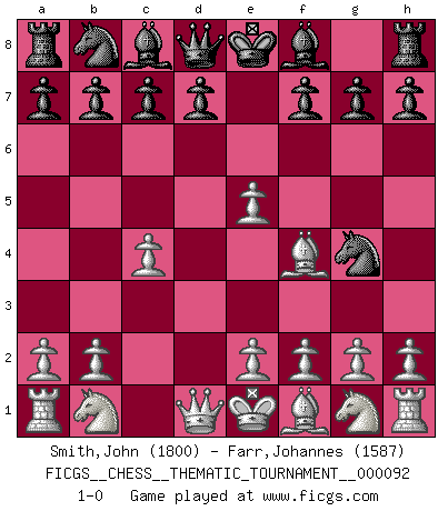 Last move : 1-0 2009 November 5 8:15:47 [Event "FICGS__CHESS__THEMATIC_TOURNAMENT__000092"] [Site "FICGS"] [Date "2009.09.10"] [Round "1"] [White "Smith,John"] [Black "Farr,Johannes"] [Result "1-0"] [WhiteElo "1800"] [BlackElo "1587"] 1.d4 Nf6 2.c4 e5 3.dxe5 Ng4 4.Bf4 1-0 This chess game has been lost on time (started : 2009.09.10 23:11:8) Budapest : Rubinstein variation Player White won this chess game. Follow this game move after move (download)Every Pawn is a potential Queen. (James Mason) Schon mancher Spieler hat aufgegeben, um zu vermeiden, daß er eine Figur verliert. (Savielly Grigorievitsch Tartakower) Tu puedes aprender mucho mas de una partida que pierdas que de una partida ganada. Tendras que perder cientos de partidas antes de llegar a ser un buen jugador. (Jose Raul Capablanca) Vouloir jouer aux échecs contre soi-même est aussi paradoxal que vouloir marcher sur son ombre. (Stefan Zweig) Who needs drugs and alcohol if he can play Big Chess at FICGS ? (Heinz-Georg Lehnhoff)