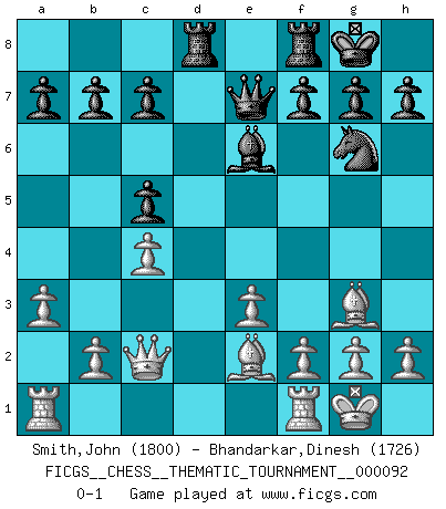 Last move : 0-1 2010 January 4 8:25:58 [Event "FICGS__CHESS__THEMATIC_TOURNAMENT__000092"] [Site "FICGS"] [Date "2009.09.10"] [Round "1"] [White "Smith,John"] [Black "Bhandarkar,Dinesh"] [Result "0-1"] [WhiteElo "1800"] [BlackElo "1726"] 1.d4 Nf6 2.c4 e5 3.dxe5 Ng4 4.Bf4 Nc6 5.Nf3 Bb4+ 6.Nbd2 Qe7 7.e3 Ngxe5 8.Nxe5 Nxe5 9.Be2 d6 10.O-O O-O 11.Nb3 Ng6 12.Bg3 Be6 13.a3 Bc5 14.Nxc5 dxc5 15.Qc2 Rad8 0-1 Budapest : Rubinstein variation Kingside Castling by player White (move 10) Kingside Castling by player Black (move 10) Player Black won this chess game. Follow this game move after move (download)By the beauty of his games, the clarity of his play, and the brilliance of his ideas, Fischer made himself an artist of the same stature as Brahms, Rembrandt, and Shakespeare. (David Levy) Ohne Leiden bildet sich kein Charakter. (Ernst Freiherr von Feuchtersleben) Yo siempre he tenido un ligero sentimiento de lástima por una persona que no tiene conocimiento del Ajedrez. (Siegbert Tarrasch) En blitz, le Cavalier l'emporte sur le Fou. (Vlastimil Hort) My poor ole parrot... Is not in the circulation of displays ....poo hoo hoo :) (Wayne Lowrance's enigma)