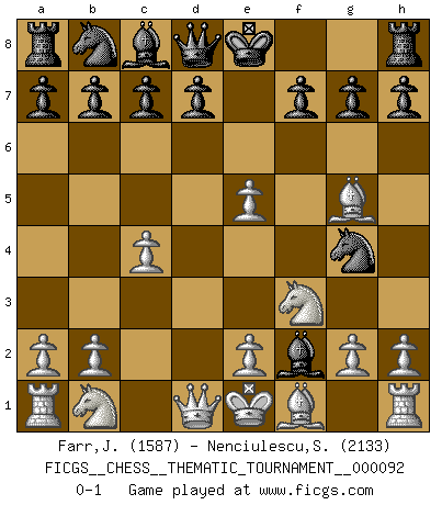 Last move : 0-1 2009 October 28 19:52:0 [Event "FICGS__CHESS__THEMATIC_TOURNAMENT__000092"] [Site "FICGS"] [Date "2009.09.10"] [Round "1"] [White "Farr,Johannes"] [Black "Nenciulescu,Silviu"] [Result "0-1"] [WhiteElo "1587"] [BlackElo "2133"] 1.d4 Nf6 2.c4 e5 3.dxe5 Ng4 4.Nf3 Bc5 5.Bg5 Bxf2+ 0-1 This chess game has been lost on time (started : 2009.09.10 23:11:8) Budapest : Adler variation Player Black won this chess game. Follow this game move after move (download)Look at Garry Kasparov. After he loses, invariably he wins the next game. He just kills the next guy. That's something that we have to learn to be able to do. (Maurice Ashley) Über Kasparov: Es ist offensichtlich, daß er in einem totalitären Staat aufwuchs und deshalb zu diktatorischen Zügen neigt. (Viktor Kortschnoi) La pasion por jugar al Ajedrez es una de las mas inexplicables en el mundo. (H.G. Wells) Des combinaisons [dans le jeu d'échecs] pareilles à des mélodies. Je crois entendre pour ainsi dire la musique des coups... (Vladimir Nabokov) The various flowers seem good to different people. (Chinese proverb)
