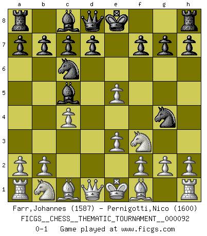Last move : 0-1 2009 October 22 9:46:10 [Event "FICGS__CHESS__THEMATIC_TOURNAMENT__000092"] [Site "FICGS"] [Date "2009.09.10"] [Round "1"] [White "Farr,Johannes"] [Black "Pernigotti,Nico"] [Result "0-1"] [WhiteElo "1587"] [BlackElo "1600"] 1.d4 Nf6 2.c4 e5 3.dxe5 Ng4 4.Nf3 Bc5 5.e3 Nc6 0-1 This chess game has been lost on time (started : 2009.09.10 23:11:8) Budapest : Adler variation Player Black won this chess game. Follow this game move after move (download)Best by test: 1. e4 (Bobby Fischer) Was ist der Unterschied zwischen einem Strassenarbeiter und einem Schachspieler? --Der Schachspieler bewegt sich ab und zu. (Anonymous) Uno no tiene que jugar muy bien, es suficiente jugar mejor que el oponente. (Siegbert Tarrasch) RxDa4 pat (...) Every vice is only an exaggeration of a necessary and virtuous function. (Ralph Waldo Emerson, Journals 1936)