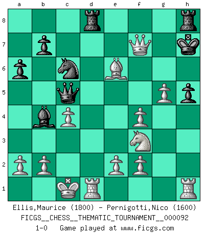 Last move : 1-0 2009 October 21 2:37:53 [Event "FICGS__CHESS__THEMATIC_TOURNAMENT__000092"] [Site "FICGS"] [Date "2009.09.10"] [Round "1"] [White "Ellis,Maurice"] [Black "Pernigotti,Nico"] [Result "1-0"] [WhiteElo "1800"] [BlackElo "1600"] 1.d4 Nf6 2.c4 e5 3.dxe5 Ng4 4.Qd5 Bb4+ 5.Nc3 Qh4 6.g3 Qe7 7.Nf3 Nc6 8.Bf4 h6 9.h3 g5 10.hxg4 gxf4 11.gxf4 d6 12.g5 h5 13.Qd3 a6 14.O-O-O dxe5 15.Nd5 e4 16.Qe3 Qc5 17.Qxe4+ Be6 18.Nxc7+ Ke7 19.Bh3 Rad8 20.Nxe6 fxe6 21.Qxe6+ Kf8 22.Qf6+ Kg8 23.Be6+ Kh7 24.Qf7+ 1-0 Budapest defense Queenside Castling by player White (move 14) Player White won this chess game. Follow this game move after move (download)I know people who have all the will in the world, but still can't play good Chess. (Bobby Fischer) Obwohl ich alt bin, darf mir niemand den Finger in den Mund stecken, sonst beisse ich. (Wilhelm Steinitz) Realmente no sabemos como el juego fue inventado, aunque hay sospechas. Tan pronto como descubramos a los culpables, se los haremos saber. (Bruce Pandolfini) Lorsque vous vous retrouvez devant une position atroce, ne tendez pas un ultime piège dérisoire avec l'intention d'abandonner si l'adversaire le déjoue ! Faites-vous plutôt un devoir de résister comme si votre vie en dépendait. Jouez le coup qui vous déplairait au centuple si vous étiez dans la peau de votre tortionnaire ! Now be brave and don't look back. Don't look back. (Shmi Skywalker in Star Wars ep.1)