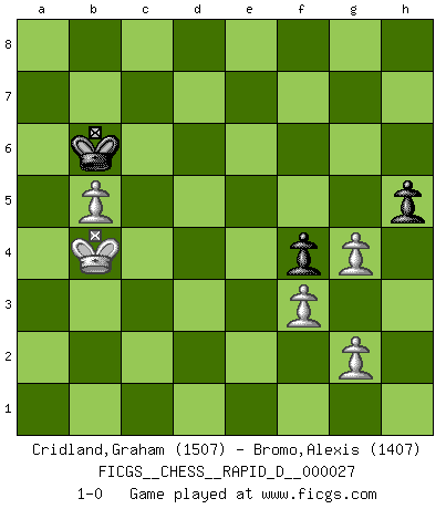 Last move : 1-0 2009 December 1 6:32:43 [Event "FICGS__CHESS__RAPID_D__000027"] [Site "FICGS"] [Date "2009.09.10"] [Round "1"] [White "Cridland,Graham"] [Black "Bromo,Alexis"] [Result "1-0"] [WhiteElo "1507"] [BlackElo "1407"] 1.e4 c5 2.Nf3 Nc6 3.d4 cxd4 4.Nxd4 Nxd4 5.Qxd4 e6 6.Nc3 b6 7.Bc4 Bc5 8.Qd3 Ne7 9.Bg5 h6 10.Bh4 g5 11.Bg3 Bb7 12.O-O-O d5 13.exd5 Nxd5 14.Nxd5 Bxd5 15.Bxd5 exd5 16.Rhe1+ Kf8 17.Qxd5 Qxd5 18.Rxd5 f6 19.Rd7 b5 20.a3 Re8 21.f3 Rxe1+ 22.Bxe1 Ke8 23.Rb7 Bb6 24.Rb8+ Bd8 25.Ba5 Kd7 26.Rxd8+ Rxd8 27.Bxd8 Kxd8 28.Kd2 Kd7 29.Kd3 Kd6 30.Kd4 a6 31.b4 f5 32.c4 bxc4 33.Kxc4 Kc6 34.a4 f4 35.b5+ axb5+ 36.axb5+ Kb6 37.Kb4 h5 38.h3 g4 39.hxg4 1-0 Sicilian defense Queenside Castling by player White (move 12) 10 pieces endgame at move 35 : White KPPPP , Black KPPPP WHITE : King + 4 Pawns BLACK : King + 4 Pawns 9 pieces endgame at move 36 : White KPPPP , Black KPPP WHITE : King + 4 Pawns BLACK : King + 3 Pawns 8 pieces endgame at move 39 : White KPPPP , Black KPP WHITE : King + 4 Pawns BLACK : King + 2 Pawns Player White won this chess game. Follow this game move after move (download)I play correspondence chess because it is both art and science while chess is art only. (A player at FICGS) Ich brauche nur einen Blick auf das Schachbrett zu werfen, und weiß schon, was in der Stellung steckt, was geschehen kann und was geschehen wird. Alle übrigen suchen und prüfen, ich aber weiß es! (José Raúl Capablanca) El jugador de combinación piensa hacia adelante; comienza de la posición dada y trabaja las movidas contundentes en su mente. (Emanuel Lasker) Dans le domaine de la peinture, de la gravure et de la sculpture, dès la première décennie de notre siècle, les artistes abandonnent la représentation de la partie d'échecs pour se concentrer sur les pièces, sur les échiquiers et sur toutes les variations auxquelles les unes et les autres peuvent donner lieu. On passe en quelque sorte d'un thème social à un thème musical (au sens de la musica médiévale, c'est-à-dire d'une notion qui inclue le rythme, l'harmonie, la construction et la déconstruction, etc.). Graphiquement et picturalement, l'échiquier apparaît comme une structure ouverte, dynamique, d'une richesse infinie, autorisant toutes les combinatoires et débouchant sur des mouvements et des rythmes de nature exponentielle. (Michel Pastoureau) It's not the will to win, but the will to prepare to win that makes the difference. (Bear Bryant)