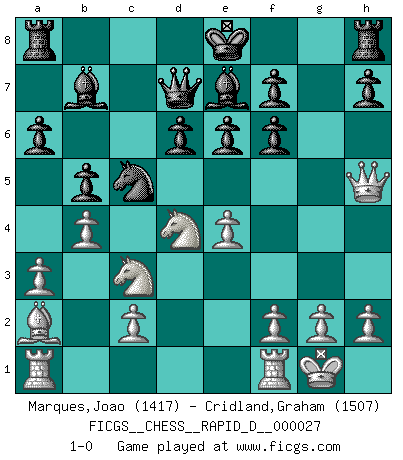 Last move : 1-0 2009 October 5 20:9:50 [Event "FICGS__CHESS__RAPID_D__000027"] [Site "FICGS"] [Date "2009.09.10"] [Round "1"] [White "Marques,Joao"] [Black "Cridland,Graham"] [Result "1-0"] [WhiteElo "1417"] [BlackElo "1507"] 1.e4 c5 2.Nf3 d6 3.d4 cxd4 4.Nxd4 Nf6 5.Nc3 a6 6.Bc4 e6 7.O-O b5 8.Bb3 Nbd7 9.Bg5 Qc7 10.a3 Nc5 11.Bxf6 gxf6 12.Qf3 Be7 13.Qg3 Kf8 14.Ba2 Bb7 15.Qh4 Ke8 16.Qh5 Qd7 17.b4 1-0 Sicilian : Najdorf, Lipnitzky attack Kingside Castling by player White (move 7) Player White won this chess game. Follow this game move after move (download)There are two types of sacrifices: correct ones and mine. (Mikhail Tal) Wie bekannt hörte Morphy 1859 auf, Schach zu spielen. Seine Enttäuschung galt nicht so sehr dem Schach, wie den Schachspielern. (Robert James Fischer) La enorme capacidad mental, en la que sin ella no puede un jugador de Ajedrez existir, es demasiado requerida por el Ajedrez al grado de que nunca podrá liberar su mente de este juego. (Albert Einstein) Je fais ceci parce que dans cinquante coups j'obtiendrai cela; je m'appelle Mikhail Moisevitch Botvinnik. (Botvinnik) Experiences are the keys to life. (Daniel Parmet)
