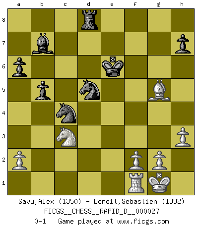 Last move : 0-1 2009 November 13 20:47:55 [Event "FICGS__CHESS__RAPID_D__000027"] [Site "FICGS"] [Date "2009.09.10"] [Round "1"] [White "Savu,Alex"] [Black "Benoit,Sebastien"] [Result "0-1"] [WhiteElo "1350"] [BlackElo "1392"] 1.e4 c5 2.d4 cxd4 3.c3 dxc3 4.Nxc3 Nc6 5.Nf3 d6 6.Bc4 a6 7.O-O Nf6 8.h3 e6 9.Bf4 b5 10.Bb3 Be7 11.Qe2 Bb7 12.Rad1 Qc7 13.Ng5 Ne5 14.Bxe6 fxe6 15.Nxe6 Qc4 16.Nxg7+ Kf7 17.Qxc4+ Nxc4 18.Nf5 Nxb2 19.Rxd6 Nc4 20.Nxe7 Kxe7 21.Rd4 Rhd8 22.Rxd8 Rxd8 23.e5 Nd5 24.Bg5+ Kf7 25.e6+ Kxe6 0-1 This chess game has been lost on time (started : 2009.09.10 23:22:40) Sicilian : Smith-Morra gambit Kingside Castling by player White (move 7) Player Black won this chess game. Follow this game move after move (download)Chess is above all, a fight ! (Emanuel Lasker) Ich suche im Schach immer etwas Eigenes. Riskantes Spiel im Stile schachlicher Musketiere ist nicht meine Sache, auch wenn es vielen Freunden scharfer Wendungen gefällt. (Anatoly Karpov) Los Peones son nacidos libres, y aún así, se encuentran encadenados por todos lados. (Rick Kennedy) Donnez-moi un Cavalier en 6e et je gagnerais toutes mes parties. (Steinitz) Hold em is to stud what chess is to checkers. (Johnny Moss)