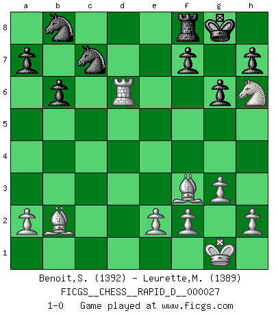 Last move : 1-0 2009 September 23 0:29:40 [Event "FICGS__CHESS__RAPID_D__000027"] [Site "FICGS"] [Date "2009.09.10"] [Round "1"] [White "Benoit,Sebastien"] [Black "Leurette,Marc-Antoine"] [Result "1-0"] [WhiteElo "1392"] [BlackElo "1389"] 1.d4 d5 2.c4 e6 3.Nf3 Nf6 4.g3 b6 5.Bg2 Bb7 6.O-O Be7 7.Nc3 O-O 8.Ne5 c5 9.cxd5 exd5 10.dxc5 d4 11.Bxb7 dxc3 12.Qxd8 Rxd8 13.Bxa8 cxb2 14.Bxb2 Bxc5 15.Rfd1 Rf8 16.Bf3 Be7 17.Rac1 g6 18.Rc7 Bd6 19.Rxd6 Ne8 20.Ng4 Nxc7 21.Nh6+ 1-0 Queen's gambit declined Kingside Castling by player White (move 6) Kingside Castling by player Black (move 7) Player White won this chess game. Follow this game move after move (download)Chess is not like life... it has rules ! (Mark Pasternak) Man wirke der falschen Auffassung entgegen, als ob jeder Zug Unmittelbares zu leisten habe; auch Werte- und Ruhezüge haben ihre Existenzberechtigung. (Aaron Nimzowitsch) La vida es como un juego de Ajedrez, cambiando con cada movimiento. (Proverbio Chino) Psychologiquement, tu dois avoir confiance en toi même, mais cette confiance doit être basée sur des faits. (Robert Fischer) The best weapon against an enemy is another enemy. (Friedrich Nietzsche)