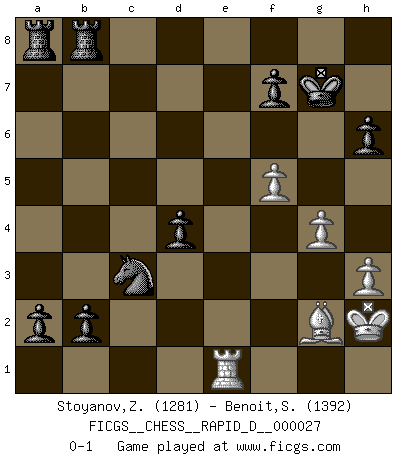 Last move : 0-1 2009 October 5 22:5:29 [Event "FICGS__CHESS__RAPID_D__000027"] [Site "FICGS"] [Date "2009.09.10"] [Round "1"] [White "Stoyanov,Zdravko"] [Black "Benoit,Sebastien"] [Result "0-1"] [WhiteElo "1281"] [BlackElo "1392"] 1.e4 c5 2.Nf3 d6 3.h3 Nf6 4.d3 Nc6 5.Bg5 e6 6.Be2 Be7 7.O-O O-O 8.Re1 h6 9.Be3 Bd7 10.Nc3 a6 11.a3 b5 12.b4 cxb4 13.axb4 Nxb4 14.Bd2 Nc6 15.Na2 Qc7 16.Nb4 Nxb4 17.Bxb4 a5 18.Bd2 Rfb8 19.c3 e5 20.Bf1 Bc6 21.Be3 d5 22.d4 exd4 23.Nxd4 Nxe4 24.Rc1 Bd6 25.Nf5 Bh2+ 26.Kh1 Be5 27.Bd4 a4 28.Qg4 Kh7 29.Bxe5 Qxe5 30.Rc2 Bd7 31.f4 Qf6 32.Qxg7+ Qxg7 33.Nxg7 Kxg7 34.Bd3 a3 35.Ra2 Nxc3 36.Rc2 b4 37.g4 d4 38.f5 b3 39.Rg2 Bc6 40.Bf1 b2 41.Kh2 Bxg2 42.Bxg2 a2 0-1 Sicilian Kingside Castling by player White (move 7) Kingside Castling by player Black (move 7) Player Black won this chess game. Follow this game move after move (download)The most important feature of the Chess position is the activity of the pieces. This is absolutely fundamental in all phases of the game: Opening, Middlegame and especially Endgame. The primary constraint on a piece's activity is the Pawn structure. (Michael Stean) Die größte Kunst beim Schach besteht darin dem Gegner nicht zu zeigen was er tun kann. (Garry Kasparov) Si tu oponente no puede hacer nada activo, entonces no apures la posición; En vez de eso, dejalo estar sentado ahí, sufriendo y rogandote por un empate. (Jeremy Silman) Il vaut toujours mieux jouer un plan faux de façon logique que de n'avoir pas de plan du tout. (Victor Kortchnoï) It's not the will to win, but the will to prepare to win that makes the difference. (Bear Bryant)