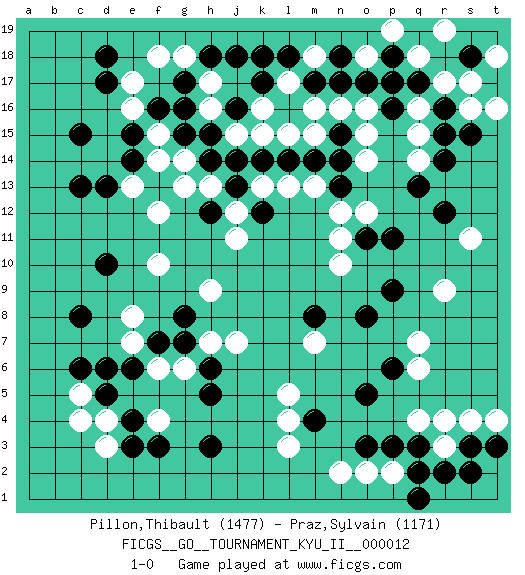 Last move : 1-0 2009 October 13 20:33:49 [Event "FICGS__GO__TOURNAMENT_KYU_II__000012"] [Site "FICGS"] [Date "2009.09.11"] [Round "1"] [Black "Pillon,Thibault"] [White "Praz,Sylvain"] [Result "1-0"] [Rating 1 "1477"] [Rating 2 "1171"] 1.p16 d4 2.c15 q4 3.c6 f4 4.d10 e16 5.d17 e17 6.d18 e13 7.c13 k16 8.o3 q6 9.h3 l3 10.q2 r3 11.h5 l5 12.o5 r9 13.e3 d3 14.f3 c5 15.d6 n2 16.m17 r17 17.r15 p17 18.o17 q16 19.r12 q15 20.p18 q18 21.r14 o14 22.j18 m7 23.m4 l4 24.r2 p2 25.p3 o2 26.q3 r4 27.s3 s4 28.t3 t4 29.s2 m16 30.q1 l17 31.l18 m18 32.q17 r19 33.r16 p17 34.n17 o18 35.q17 p19 36.p17 q14 37.k18 s17 38.s18 t18 39.n18 s16 40.q13 o15 41.p11 o12 42.o11 n11 43.o8 n10 44.p9 f10 45.e15 f15 46.e14 f14 47.g16 h17 48.g17 g18 49.h18 h16 50.h15 j15 51.g15 f18 52.f16 h13 53.f13 g14 54.h14 g13 55.j14 k13 56.j13 j12 57.h12 f12 58.k12 j11 59.k14 l13 60.j16 k15 61.l14 l15 62.m14 m15 63.n15 n16 64.n14 o16 65.k17 m13 66.n13 n12 67.e4 e8 68.c8 h7 69.d13 s11 70.p6 q7 71.d5 c4 72.g7 g6 73.h6 j7 74.g8 f6 75.f7 e7 76.e6 h9 77.s15 t16 78.m8 1-0 Here are the names of the openings (joseki) played in the four corners : Corner d4 : d4 c6 Hoshi (Hwajeom, Seongjeom, Xingwei`) 4-4 Point. The star or hoshi (4-4) point, emphasizing influence at the potential expense of territory. Ikken Kakari (Hankan Keolch'im, Yi Gua`jiao~, 1-Space Low Approach). Black 2 is the standard approach move to the 4-4. Corner d16 : c15 e16 Mokuhazushi (Waemok, Wai`mu`) 5-3 Point. The mokuhazushi (5-3) point was popular in the Edo period in Japan (1600 - 1867). It emphasizes influence; territorially, it is inferior to the 3-4 point. Takamoku Kakari. White prevents Black from gaining influence, but in the local context, abandoning profit in the corner entails a loss. Black 3-4 and 4-4 are best. Corner q4 : q4 o3 Hoshi (Hwajeom, Seongjeom, Xingwei`) 4-4 Point. The star or hoshi (4-4) point, emphasizing influence at the potential expense of territory. Ikken Kakari (Hankan Keolch'im, Yi Gua`jiao~, 1-Space Low Approach). Black 2 is the standard approach move to the 4-4. Player Black won this Go (weiqi, baduk) game. Follow this game move after move (download)A few moments to learn, a lifetime to master. (Ancient proverb) All war is based on deception. (Sun Tzu)