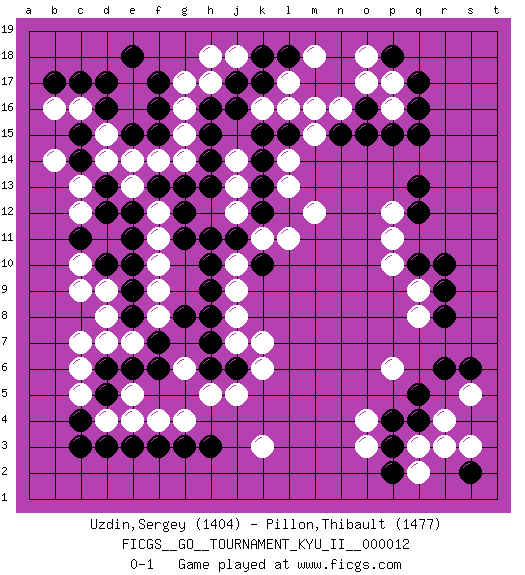 Last move : 0-1 2009 September 29 22:16:52 [Event "FICGS__GO__TOURNAMENT_KYU_II__000012"] [Site "FICGS"] [Date "2009.09.11"] [Round "1"] [Black "Uzdin,Sergey"] [White "Pillon,Thibault"] [Result "0-1"] [Rating 1 "1404"] [Rating 2 "1477"] 1.q16 e16 2.q4 c5 3.d3 e4 4.e3 f4 5.g3 c10 6.r10 o17 7.o16 p16 8.p15 p17 9.q15 n16 10.o15 o3 11.p3 o4 12.r6 k3 13.q17 l17 14.d16 d15 15.d17 e17 16.c15 d14 17.c14 q9 18.r9 q8 19.n15 m16 20.d13 e13 21.e12 c13 22.d12 c12 23.e18 c16 24.e15 e14 25.c17 b16 26.f15 g14 27.b17 b14 28.f17 r3 29.p2 r4 30.q5 q3 31.p4 q2 32.s2 s5 33.s6 s3 34.c3 g4 35.h3 j5 36.g13 f14 37.q10 p10 38.h13 f12 39.e10 f10 40.e9 f9 41.e8 f8 42.f13 f11 43.f3 p11 44.q12 k11 45.h14 g15 46.f16 p12 47.q13 h17 48.k13 m12 49.h11 l14 50.k10 j10 51.j11 l11 52.h10 j9 53.h9 j8 54.h8 j7 55.h15 g16 56.d10 c9 57.l15 m15 58.k14 l13 59.h16 g17 60.j17 k16 61.j16 j18 62.f6 e7 63.k15 j14 64.g12 j12 65.k12 j13 66.f7 d7 67.d5 d4 68.c4 e5 69.h6 h5 70.j6 k6 71.h7 k7 72.g8 g6 73.k18 h18 74.k17 l16 75.r8 p6 76.p18 o18 77.l18 m18 78.d6 c6 79.e6 c7 80.g11 d11 81.e11 d8 82.c11 d9 0-1 Here are the names of the openings (joseki) played in the four corners : Corner d4 : c5 d3 Mokuhazushi (Waemok, Wai`mu`) 5-3 Point. The mokuhazushi (5-3) point was popular in the Edo period in Japan (1600 - 1867). It emphasizes influence; territorially, it is inferior to the 3-4 point. Komoku Kakari. Black 2 is the standard approach because of its solidity and stability. Corner q16 : q16 o17 Hoshi (Hwajeom, Seongjeom, Xingwei`) 4-4 Point. The star or hoshi (4-4) point, emphasizing influence at the potential expense of territory. Ikken Kakari (Hankan Keolch'im, Yi Gua`jiao~, 1-Space Low Approach). White 2 is the standard approach move to the 4-4. Corner q4 : q4 o3 Hoshi (Hwajeom, Seongjeom, Xingwei`) 4-4 Point. The star or hoshi (4-4) point, emphasizing influence at the potential expense of territory. Ikken Kakari (Hankan Keolch'im, Yi Gua`jiao~, 1-Space Low Approach). White 2 is the standard approach move to the 4-4. Corner d16 : e16 d16 Takamoku (Gomok, Gaomu`) 5-4 Point. The takamoku (high) point (5-4). With its emphasis on influence, the 5-4 point complements the 4-4 (hoshi) point in creating an influence-oriented fuseki. Player White won this Go (weiqi, baduk) game. Follow this game move after move (download)Play slow, win slow; play fast, lose fast. (Anonymous) Hello Thibault, if I have had a plan (and I had one, I hope), I have forgotten it during the last week... - Hello Heinz-Georg. What do you mean a plan ? (Anonymous players, during a Big Chess game)
