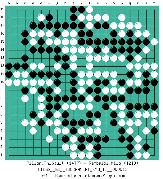 Last move : 0-1 2009 November 16 17:45:1 [Event "FICGS__GO__TOURNAMENT_KYU_II__000012"] [Site "FICGS"] [Date "2009.09.11"] [Round "1"] [Black "Pillon,Thibault"] [White "Rambaldi,Milo"] [Result "0-1"] [Rating 1 "1477"] [Rating 2 "1219"] 1.p17 d4 2.c15 q4 3.n3 r6 4.h3 f3 5.h5 c5 6.d17 r16 7.q14 p16 8.q16 q17 9.q15 r17 10.o16 p15 11.o14 o17 12.o15 p18 13.k16 d10 14.r9 r11 15.p10 p13 16.p14 r13 17.r14 q10 18.q9 p9 19.p8 o9 20.q7 o11 21.o8 n9 22.q2 r3 23.p3 r2 24.c12 b10 25.p4 p5 26.o5 p6 27.o6 o7 28.n7 p7 29.n8 l17 30.k17 k18 31.j18 l18 32.h17 e12 33.e11 d12 34.d11 c11 35.c13 g12 36.f14 f10 37.c9 c10 38.e9 e10 39.d6 f5 40.f6 g6 41.g7 e6 42.f7 e7 43.e5 e8 44.f8 d5 45.m9 g5 46.m10 n11 47.h6 h7 48.h8 j7 49.j8 k7 50.k8 h4 51.j4 g4 52.j5 j3 53.k3 j2 54.k2 h2 55.f9 d9 56.l16 k4 57.k5 l4 58.l5 m4 59.m3 m5 60.l6 l7 61.m6 l8 62.l9 g9 63.g8 k9 64.j9 k10 65.j10 k11 66.j11 j12 67.k12 l12 68.k13 l11 69.h12 j13 70.h13 j14 71.g11 h14 72.g13 l14 73.l15 j15 74.f11 g15 75.g10 c8 76.m14 m13 77.r7 s6 78.n17 n18 79.p17 p16 80.s11 f16 81.f18 e18 82.f17 e16 83.e17 d16 84.c16 s12 85.q11 r10 86.s10 r12 87.m17 m18 88.s15 t11 89.s9 s16 90.q3 q5 91.s7 l2 92.l3 k1 93.t4 t5 94.s5 t6 95.s2 s1 96.m2 l1 97.m1 j1 98.q1 r1 99.g16 f15 100.e14 m11 101.m8 n14 102.m15 o13 103.n15 s14 104.r15 t15 105.t7 s4 106.q6 r5 107.t10 t12 108.n10 o10 109.b12 j16 110.j17 h16 111.g17 n13 112.q13 q12 113.a11 d15 114.d14 a10 115.k19 b11 116.g14 k14 117.e15 h15 118.k15 l13 119.a12 l19 120.j19 l10 121.p15 p17 0-1 Here are the names of the openings (joseki) played in the four corners : Corner q4 : q4 n3 Hoshi (Hwajeom, Seongjeom, Xingwei`) 4-4 Point. The star or hoshi (4-4) point, emphasizing influence at the potential expense of territory. Nikken Kakari (Dukan Keolch'im, E`r Gua`jiao~, 2-Space Low Approach). White typically answers by 7-3 or 3-5 (which is not joseki). Corner d4 : d4 h3 Hoshi (Hwajeom, Seongjeom, Xingwei`) 4-4 Point. The star or hoshi (4-4) point, emphasizing influence at the potential expense of territory. Corner q16 : p17 r16 Mokuhazushi (Waemok, Wai`mu`) 5-3 Point. The mokuhazushi (5-3) point was popular in the Edo period in Japan (1600 - 1867). It emphasizes influence; territorially, it is inferior to the 3-4 point. Komoku Kakari. White 2 is the standard approach because of its solidity and stability. Player White won this Go (weiqi, baduk) game. Follow this game move after move (download)Go is not a blocking game, it's a game of action. (Pierre Audouard) 98% of all statistics are made up. (Author unknown)