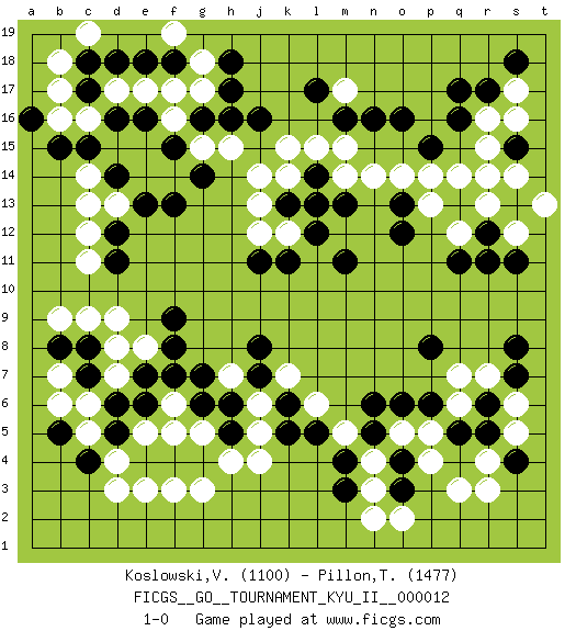 Last move : 1-0 2010 February 4 16:23:10 [Event "FICGS__GO__TOURNAMENT_KYU_II__000012"] [Site "FICGS"] [Date "2009.09.11"] [Round "1"] [Black "Koslowski,Volker"] [White "Pillon,Thibault"] [Result "1-0"] [Rating 1 "1100"] [Rating 2 "1477"] 1.d16 p5 2.q16 e5 3.m11 c14 4.o3 q3 5.f9 f16 6.p8 d9 7.k6 j4 8.j16 r14 9.f13 d17 10.h5 h4 11.g4 g3 12.f4 f3 13.e4 e3 14.d5 d4 15.e6 c5 16.s4 r3 17.q13 r13 18.r12 q14 19.d6 c6 20.o16 q12 21.q11 p13 22.o6 o5 23.c17 e17 24.d14 d13 25.f15 c16 26.c15 b16 27.b15 b17 28.c18 b18 29.n5 n4 30.m4 n3 31.m3 n2 32.r11 s16 33.e16 g17 34.f18 f17 35.o4 o2 36.o12 d7 37.c4 d3 38.e13 c13 39.e7 e8 40.c7 b7 41.c8 d8 42.f8 c9 43.r17 s17 44.s18 r16 45.q17 q7 46.h17 g18 47.p6 q6 48.q5 p4 49.r5 s6 50.s15 r15 51.r6 r7 52.d18 g15 53.g14 h15 54.e18 c19 55.h18 f19 56.s13 s14 57.h16 s12 58.g16 f6 59.s8 s5 60.f7 g5 61.s7 r4 62.g6 f5 63.b5 b6 64.s11 t13 65.d12 c12 66.d11 c11 67.k5 n14 68.m13 m14 69.l14 m17 70.n16 m15 71.o13 o14 72.m16 l15 73.p15 p14 74.b8 b9 75.l17 k14 76.k13 j14 77.a16 l13 78.l12 j12 79.j11 k12 80.l14 j13 81.l13 k15 82.k11 j5 83.h6 j6 84.j7 h7 85.g7 k7 86.j8 m5 87.n6 l6 88.l5 1-0 Here are the names of the openings (joseki) played in the four corners : Corner d16 : d16 c14 Hoshi (Hwajeom, Seongjeom, Xingwei`) 4-4 Point. The star or hoshi (4-4) point, emphasizing influence at the potential expense of territory. Ikken Kakari (Hankan Keolch'im, Yi Gua`jiao~, 1-Space Low Approach). White 2 is the standard approach move to the 4-4. Corner q4 : p5 o3 Go-no-go (Wu~wu~) 5-5 Point. The 5-5 was experimented with briefly during the "New Fuseki" movement in Japan in the 1930s. The 5-5 point has not retained popularity because the 4-4 hoshi (star) point strikes a better balance between influence and territory. As one can see from the variations, though, the 5-5 is playable. Oomokuhazushi. Black forsakes the corner for the right. White continues with 3-4. Corner d4 : e5 f9 Go-no-go (Wu~wu~) 5-5 Point. The 5-5 was experimented with briefly during the "New Fuseki" movement in Japan in the 1930s. The 5-5 point has not retained popularity because the 4-4 hoshi (star) point strikes a better balance between influence and territory. As one can see from the variations, though, the 5-5 is playable. Player Black won this Go (weiqi, baduk) game. Follow this game move after move (download)Don't reduce your own liberties. (Bill Taylor) The human is the only animal species whose members are able to talk themselves into difficulties that would not otherwise exist. (Wendell Johnson)