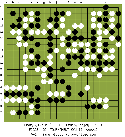 Last move : 0-1 2009 October 22 23:45:19 [Event "FICGS__GO__TOURNAMENT_KYU_II__000012"] [Site "FICGS"] [Date "2009.09.11"] [Round "1"] [Black "Praz,Sylvain"] [White "Uzdin,Sergey"] [Result "0-1"] [Rating 1 "1171"] [Rating 2 "1404"] 1.r16 d4 2.q3 d17 3.d15 c13 4.c17 d16 5.c16 c15 6.d18 e15 7.d14 c14 8.e16 e17 9.f16 e18 10.b18 f15 11.f17 d13 12.e14 q4 13.f13 g15 14.f18 d9 15.h13 j15 16.j17 l15 17.h15 h16 18.h14 r4 19.p3 p4 20.o3 r3 21.f3 e3 22.f4 d6 23.k4 q14 24.r12 q16 25.r17 r9 26.p12 r15 27.q17 p16 28.p14 p17 29.s15 s14 30.t16 k17 31.j16 k16 32.h17 p9 33.p15 q15 34.r13 n16 35.f6 q13 36.p13 q12 37.q11 r11 38.p10 o9 39.n5 l12 40.r10 s11 41.s10 s12 42.n11 o11 43.o10 n9 44.q9 o12 45.n12 o13 46.n14 q8 47.q10 s9 48.l13 k13 49.k12 k11 50.l11 j12 51.l10 m8 52.k9 h10 53.k7 h7 54.h8 g7 55.j7 h5 56.h4 j5 57.j4 k5 58.l5 o6 59.l6 g8 60.c5 c6 61.d5 c4 62.b5 b4 63.e4 e2 64.f2 b6 65.a5 a6 66.e5 a4 67.c2 b2 68.d2 q18 69.r18 p18 70.f11 e11 71.e10 d10 72.e12 d11 73.f10 f9 74.h9 g9 75.g10 h11 76.h12 s18 77.r19 s17 78.t18 s16 79.t14 t13 80.m15 m16 81.b16 b15 82.l14 k14 83.k18 l18 84.j18 m12 85.m11 n13 86.n10 p11 87.m14 m13 0-1 Here are the names of the openings (joseki) played in the four corners : Corner d16 : d17 d15 Komoku (Somok, Xiao~mu`) 3-4 Point. The komoku (3-4) point is the traditional corner enclosure move.. Ikken Takagakari (Hankan Nop'dakeolch'im, Yi Gaogua`jiao~, 1-Space High Approach). The 5-4 approach move has become more popular in modern times, as modern Go emphasizes speed and influence. Corner q4 : q3 q4 Komoku (Somok, Xiao~mu`) 3-4 Point. The komoku (3-4) point is the traditional corner enclosure move.. Corner q16 : r16 l15 Komoku (Somok, Xiao~mu`) 3-4 Point. The komoku (3-4) point is the traditional corner enclosure move.. Player White won this Go (weiqi, baduk) game. Follow this game move after move (download)To emphasize the lack of determination in his moves, one speaks of chance. (Pierre Audouard) In my experience, there's no such thing as luck. (Obi-Wan Kenobi in Star Wars ep.4)