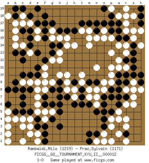 Last move : 1-0 2009 December 29 19:7:0 [Event "FICGS__GO__TOURNAMENT_KYU_II__000012"] [Site "FICGS"] [Date "2009.09.11"] [Round "1"] [Black "Rambaldi,Milo"] [White "Praz,Sylvain"] [Result "1-0"] [Rating 1 "1219"] [Rating 2 "1171"] 1.q16 d4 2.q3 d17 3.f3 q5 4.o4 r3 5.r2 r4 6.p2 r8 7.c6 f4 8.g4 f5 9.e3 d3 10.e4 e5 11.d5 b4 12.h3 e2 13.f2 e7 14.c8 b7 15.c7 b6 16.b5 a5 17.c5 c4 18.a6 a7 19.b8 a4 20.c12 c14 21.h6 g7 22.h7 f9 23.e11 d9 24.c10 f11 25.e10 f10 26.f12 j10 27.g8 f8 28.h8 g12 29.g13 h12 30.e13 h13 31.g14 e15 32.f16 r14 33.a8 q11 34.c2 d2 35.b2 a2 36.b1 e1 37.b3 c1 38.d1 a3 39.f1 a1 40.a6 c1 41.d16 c3 42.c16 e16 43.e17 e18 44.f17 c17 45.d15 b16 46.d14 b15 47.b13 b14 48.k16 p15 49.p16 o15 50.n16 r17 51.q17 r16 52.q15 q14 53.r15 s15 54.s14 s16 55.s13 q18 56.o17 o16 57.p17 p13 58.p18 r18 59.n17 m14 60.o6 p4 61.p5 p6 62.o5 q4 63.p7 p3 64.o3 q2 65.q1 o2 66.q3 d13 67.c13 q2 68.r10 p1 69.n2 r11 70.s11 m8 71.m6 k7 72.l7 k8 73.k6 n7 74.q6 r6 75.q10 p10 76.q8 s9 77.s10 p11 78.r7 s7 79.q7 s6 80.r9 s8 81.l8 l9 82.k9 j9 83.m9 l10 84.n9 n11 85.f18 k14 86.d18 c18 87.e19 p9 88.q9 o8 89.j7 j8 90.h9 h10 91.f6 e6 92.g6 g5 93.h5 j15 94.b18 b17 95.c19 a18 96.b19 n6 97.n5 m7 98.l6 r1 99.f7 e8 100.j16 h15 101.h16 g15 102.f15 n1 103.m2 m15 104.q19 r19 105.t15 t16 106.t18 s18 107.t17 m16 108.m17 l16 109.l17 n15 110.r12 q12 111.m1 o1 112.h14 j14 113.d8 e9 114.d10 c9 115.b9 g16 116.g17 r13 117.s12 t14 118.t19 p19 119.o19 g9 120.o7 n8 121.p8 o9 122.t9 t8 123.t10 1-0 Here are the names of the openings (joseki) played in the four corners : Corner d4 : d4 f3 Hoshi (Hwajeom, Seongjeom, Xingwei`) 4-4 Point. The star or hoshi (4-4) point, emphasizing influence at the potential expense of territory. Ikken Kakari (Hankan Keolch'im, Yi Gua`jiao~, 1-Space Low Approach). Black 2 is the standard approach move to the 4-4. Corner q4 : q3 q5 Komoku (Somok, Xiao~mu`) 3-4 Point. The komoku (3-4) point is the traditional corner enclosure move.. Ikken Takagakari (Hankan Nop'dakeolch'im, Yi Gaogua`jiao~, 1-Space High Approach). The 5-4 approach move has become more popular in modern times, as modern Go emphasizes speed and influence. Corner d16 : d17 c12 Komoku (Somok, Xiao~mu`) 3-4 Point. The komoku (3-4) point is the traditional corner enclosure move.. Corner q16 : q16 r14 Hoshi (Hwajeom, Seongjeom, Xingwei`) 4-4 Point. The star or hoshi (4-4) point, emphasizing influence at the potential expense of territory. Ikken Kakari (Hankan Keolch'im, Yi Gua`jiao~, 1-Space Low Approach). White 2 is the standard approach move to the 4-4. Player Black won this Go (weiqi, baduk) game. Follow this game move after move (download)You don't have to be really good anymore to get good results. What's happening with chess is that it's gradually losing its place as the par excellence of intellectual activity. Smart people in search of a challenging board game might try a game called Go. (Hans Berliner, The New York Times, 2003) Never risk one's whole fortune unless supported by one's entire army. (Niccolo Machiavelli)
