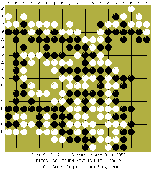 Last move : 1-0 2009 November 9 3:54:33 [Event "FICGS__GO__TOURNAMENT_KYU_II__000012"] [Site "FICGS"] [Date "2009.09.11"] [Round "1"] [Black "Praz,Sylvain"] [White "Suarez-Moreno,Alejandro"] [Result "1-0"] [Rating 1 "1171"] [Rating 2 "1295"] 1.r16 d4 2.q3 d17 3.d15 f16 4.c17 c18 5.c16 j17 6.c12 p17 7.q15 n16 8.r10 k4 9.r6 o4 10.c6 d8 11.e6 f4 12.b4 c3 13.b8 c7 14.b7 f8 15.g6 c5 16.d6 b5 17.b6 h8 18.h3 g3 19.h5 j6 20.j7 k6 21.j8 h7 22.h6 j9 23.l7 k7 24.k8 k9 25.l8 g9 26.o6 n6 27.n7 m6 28.n8 c13 29.b13 c11 30.b11 d12 31.b12 c10 32.b10 e13 33.o15 n15 34.o16 o17 35.o14 m12 36.e16 e17 37.c14 d13 38.m13 n13 39.n14 m14 40.l13 o12 41.l12 l10 42.m11 n12 43.l11 m10 44.n10 q4 45.q5 p3 46.r4 p4 47.n11 h12 48.k15 l15 49.j14 h14 50.h15 j16 51.h13 g14 52.j15 k16 53.l14 m15 54.g4 g2 55.k2 h2 56.j3 k3 57.j2 l2 58.g16 g17 59.g13 g12 60.f13 f12 61.f14 r17 62.q17 q18 63.q16 s17 64.s16 b17 65.b16 a18 66.j11 h10 67.h11 g11 68.q2 p2 69.a5 b3 70.a4 a3 71.r3 j12 72.k10 l9 73.p1 o1 74.q1 n2 75.e4 e3 76.e5 f5 77.f6 j4 78.h4 j10 79.k11 t16 80.t15 t17 81.s15 h16 82.g15 d16 83.c9 d9 84.l6 l5 85.l1 m1 86.l3 m3 87.m2 m7 88.m8 l2 89.m5 n5 90.m2 m4 91.n1 p6 92.p5 m1 93.l2 n3 94.n1 o2 95.a16 o7 96.p7 o8 97.p8 o9 98.n9 o5 99.q6 o6 100.p10 o10 101.o11 p9 102.q9 a17 103.a6 c4 104.e15 k13 105.k14 g7 106.c8 l4 107.d7 e8 108.f15 f17 109.j5 k5 110.p16 m1 111.g5 f3 112.n1 p11 113.q10 m1 114.r18 s18 115.p18 r19 116.n1 c15 117.b15 m1 118.n17 1-0 Here are the names of the openings (joseki) played in the four corners : Corner d16 : d17 d15 Komoku (Somok, Xiao~mu`) 3-4 Point. The komoku (3-4) point is the traditional corner enclosure move.. Ikken Takagakari (Hankan Nop'dakeolch'im, Yi Gaogua`jiao~, 1-Space High Approach). The 5-4 approach move has become more popular in modern times, as modern Go emphasizes speed and influence. Corner q16 : r16 p17 Komoku (Somok, Xiao~mu`) 3-4 Point. The komoku (3-4) point is the traditional corner enclosure move.. Ikken Kakari (Hankan Keolch'im, Yi Gua`jiao~, 1-Space Low Pincer). The small knight move is the basic approach move to the 3-4 point stone. It has been continually used for over four centuries. There are limitless variations, with new moves constantly being discovered. White 2 opens the door to a treaure store of joseki. Corner d4 : d4 c6 Hoshi (Hwajeom, Seongjeom, Xingwei`) 4-4 Point. The star or hoshi (4-4) point, emphasizing influence at the potential expense of territory. Ikken Kakari (Hankan Keolch'im, Yi Gua`jiao~, 1-Space Low Approach). Black 2 is the standard approach move to the 4-4. Player Black won this Go (weiqi, baduk) game. Follow this game move after move (download)The L-group is dead. (Anonymous) I've never seen so many men wasted so badly. (Blondie in The Good, The Bad and The Ugly)
