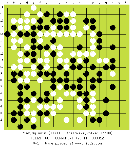 Last move : 0-1 2010 March 24 11:41:29 [Event "FICGS__GO__TOURNAMENT_KYU_II__000012"] [Site "FICGS"] [Date "2009.09.11"] [Round "1"] [Black "Praz,Sylvain"] [White "Koslowski,Volker"] [Result "0-1"] [Rating 1 "1171"] [Rating 2 "1100"] 1.r16 d4 2.q3 d16 3.f17 c14 4.j16 o6 5.q5 o12 6.o17 j9 7.f3 j4 8.c6 d8 9.c3 d3 10.c4 d6 11.d5 e5 12.c5 j15 13.k16 l15 14.n4 r9 15.r7 h16 16.h17 f4 17.g3 c2 18.b2 m5 19.p13 o13 20.p14 g15 21.p9 p11 22.q10 q11 23.r10 e2 24.b3 o9 25.p8 o4 26.n5 n3 27.n6 m4 28.o7 n7 29.m7 n8 30.m6 o5 31.m8 m9 32.k7 l6 33.k9 l9 34.k8 k10 35.h7 l8 36.l7 k6 37.h8 h6 38.j6 j5 39.h9 j7 40.j8 g10 41.j10 j11 42.l10 k11 43.m10 l16 44.m13 k18 45.g16 o14 46.p15 h15 47.k17 l17 48.d17 c17 49.e16 d18 50.d15 e17 51.e18 d17 52.e15 k15 53.j17 f18 54.g18 e19 55.j18 l18 56.e13 d11 57.c15 d13 58.d12 c12 59.e12 f15 60.f16 b15 61.e11 e10 62.d10 c11 63.f10 e9 64.f9 f11 65.g13 f14 66.e14 g12 67.f13 h13 68.h12 j12 69.h14 j13 70.b16 b13 71.a15 b14 72.c7 f8 73.g9 g11 74.b9 c10 75.d7 o15 76.o16 n16 77.n17 c16 78.r13 m15 79.c9 d9 80.e6 h3 81.f5 g4 82.e4 e3 83.g5 e5 84.c1 m2 85.e4 h4 86.d2 m11 87.n9 c8 88.b8 n10 89.o8 b10 90.l11 l12 91.n11 m12 92.o10 g2 93.e1 e5 94.g6 b17 95.o2 o3 96.p2 k2 97.r11 n12 0-1 Here are the names of the openings (joseki) played in the four corners : Corner d16 : d16 f17 Hoshi (Hwajeom, Seongjeom, Xingwei`) 4-4 Point. The star or hoshi (4-4) point, emphasizing influence at the potential expense of territory. Ikken Kakari (Hankan Keolch'im, Yi Gua`jiao~, 1-Space Low Approach). Black 2 is the standard approach move to the 4-4. Corner q4 : q3 o6 Komoku (Somok, Xiao~mu`) 3-4 Point. The komoku (3-4) point is the traditional corner enclosure move.. Corner q16 : r16 o12 Komoku (Somok, Xiao~mu`) 3-4 Point. The komoku (3-4) point is the traditional corner enclosure move.. Player White won this Go (weiqi, baduk) game. Follow this game move after move (download)To invade, need 20 points in open area; otherwise, keshi is best. (Yang Yilun, 7p) Those parts of the system that you can hit with a hammer (not advised) are called hardware; those program instructions that you can only curse at are called software. (Anonymous)