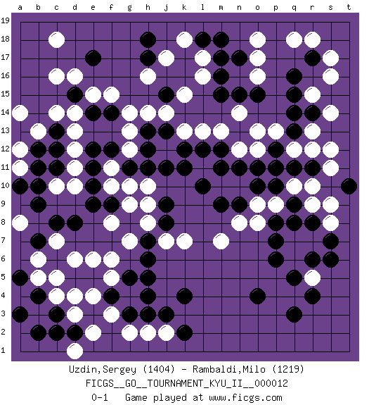 Last move : 0-1 2009 October 30 8:31:21 [Event "FICGS__GO__TOURNAMENT_KYU_II__000012"] [Site "FICGS"] [Date "2009.09.11"] [Round "1"] [Black "Uzdin,Sergey"] [White "Rambaldi,Milo"] [Result "0-1"] [Rating 1 "1404"] [Rating 2 "1219"] 1.q16 d4 2.q3 c16 3.e17 d14 4.q9 o17 5.o15 l17 6.h17 q18 7.r17 r18 8.o4 c18 9.j15 r15 10.q15 s17 11.r14 s16 12.f4 d6 13.k4 r5 14.r4 r7 15.r8 s8 16.s7 r9 17.q8 s9 18.r6 q7 19.s6 s12 20.p7 q6 21.q5 q10 22.r11 r13 23.q13 r12 24.q11 q12 25.p10 r10 26.p11 s11 27.p12 p13 28.q14 o13 29.m15 p9 30.p8 o9 31.o10 n10 32.n9 o8 33.n11 m10 34.m11 l11 35.n13 n12 36.m12 o12 37.o11 m13 38.l12 l13 39.k12 n14 40.n15 k13 41.j13 j12 42.k11 j14 43.h13 k15 44.c8 h14 45.l10 n8 46.m9 m7 47.p6 k7 48.c11 c7 49.d8 f6 50.h5 g7 51.e5 e6 52.d5 c5 53.c3 d3 54.d2 e2 55.b2 c4 56.b4 d1 57.c2 b5 58.a3 g4 59.g5 f3 60.g3 g2 61.h3 h2 62.j3 j2 63.k2 f5 64.h4 e4 65.e12 g13 66.h12 g12 67.h11 g14 68.g11 f11 69.m17 l16 70.l18 k18 71.n17 o18 72.m16 o16 73.t10 s14 74.m18 j17 75.h18 h16 76.f12 f10 77.e14 e15 78.f14 f15 79.d15 d16 80.f9 g10 81.h7 h8 82.g8 h10 83.j11 j7 84.h6 f8 85.j8 h9 86.j9 d13 87.e9 g9 88.c12 b13 89.c13 c14 90.b12 d12 91.e11 d11 92.e10 d10 93.b9 c10 94.b10 a12 95.b11 a14 96.b7 a11 97.a10 a8 98.a5 b6 0-1 Here are the names of the openings (joseki) played in the four corners : Corner d16 : c16 e17 Komoku (Somok, Xiao~mu`) 3-4 Point. The komoku (3-4) point is the traditional corner enclosure move.. Ikken Kakari (Hankan Keolch'im, Yi Gua`jiao~, 1-Space Low Pincer). The small knight move is the basic approach move to the 3-4 point stone. It has been continually used for over four centuries. There are limitless variations, with new moves constantly being discovered. Black 2 opens the door to a treaure store of joseki. Corner q16 : q16 o17 Hoshi (Hwajeom, Seongjeom, Xingwei`) 4-4 Point. The star or hoshi (4-4) point, emphasizing influence at the potential expense of territory. Ikken Kakari (Hankan Keolch'im, Yi Gua`jiao~, 1-Space Low Approach). White 2 is the standard approach move to the 4-4. Corner d4 : d4 f4 Hoshi (Hwajeom, Seongjeom, Xingwei`) 4-4 Point. The star or hoshi (4-4) point, emphasizing influence at the potential expense of territory. Ikken Takagakari (Hankan Nop'dakeolch'im, Yi Gaojia, 1-Space High Approach). White typically responds at 6-4 or 3-10. White 4-10 is played when White finds play on the right side advantageous. White 4-8 or 3-8 may be played when White has support at top. Player White won this Go (weiqi, baduk) game. Follow this game move after move (download)Conservative and slow will win. Believe it ! (Anonymous) Be who you are, and say what you feel because those who mind don't matter, and those who matter don't mind. (Dr Seuss)