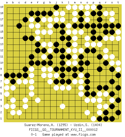 Last move : 0-1 2009 November 16 8:55:7 [Event "FICGS__GO__TOURNAMENT_KYU_II__000012"] [Site "FICGS"] [Date "2009.09.11"] [Round "1"] [Black "Suarez-Moreno,Alejandro"] [White "Uzdin,Sergey"] [Result "0-1"] [Rating 1 "1295"] [Rating 2 "1404"] 1.q17 q4 2.c16 d3 3.d5 f4 4.c3 c2 5.c4 b2 6.d8 k3 7.k16 e16 8.d14 h17 9.f17 h15 10.g16 h16 11.n16 q15 12.r15 r14 13.r16 q13 14.r6 r5 15.q6 o4 16.q9 r11 17.r10 e17 18.d17 f15 19.e18 o14 20.e11 g15 21.g18 k17 22.l17 k18 23.l18 m14 24.q11 r12 25.k14 l15 26.k15 l16 27.j13 g13 28.h11 m17 29.n17 m18 30.n18 l12 31.l13 m13 32.h8 s6 33.s7 k6 34.o7 h12 35.j12 j11 36.k11 j10 37.l11 m11 38.k12 m12 39.l9 m7 40.k9 g11 41.h10 h9 42.g10 g9 43.f10 g8 44.j9 h7 45.s5 s4 46.t6 e6 47.d6 a5 48.a4 b4 49.b5 a3 50.a6 b6 51.a4 d7 52.c6 a5 53.b7 e8 54.d9 s14 55.s15 n8 56.o10 s10 57.s9 s11 58.o12 n6 59.o8 j8 60.f12 b3 61.g12 h13 62.l7 l6 63.k7 e5 64.j7 j6 65.h18 j18 66.s3 r3 67.t4 s2 68.r4 q5 69.r2 s4 70.m16 l19 71.r4 q3 72.s1 q2 73.t2 g17 74.p5 p4 75.o5 n5 76.p16 n19 77.o19 o18 78.m19 c7 79.c8 n19 80.p18 p19 81.q19 e7 82.o19 d4 83.c5 b6 84.a8 m19 85.q1 p1 86.r1 o2 87.p14 p13 88.p15 o13 89.q14 m10 90.m9 p19 91.j19 o19 92.n9 e9 93.e10 r18 94.q18 o17 95.o16 t15 96.t16 t14 97.q16 a7 98.b8 f16 99.f18 l10 100.k10 s17 101.s16 s18 102.f13 a6 103.j16 j17 104.m8 n7 105.k8 h8 106.l14 m15 107.p12 f14 108.e14 t9 109.t8 t10 110.n11 n12 111.n10 n15 112.o6 s4 0-1 Here are the names of the openings (joseki) played in the four corners : Corner d4 : d3 d5 Komoku (Somok, Xiao~mu`) 3-4 Point. The komoku (3-4) point is the traditional corner enclosure move.. Ikken Takagakari (Hankan Nop'dakeolch'im, Yi Gaogua`jiao~, 1-Space High Approach). The 5-4 approach move has become more popular in modern times, as modern Go emphasizes speed and influence. Corner d16 : c16 e16 Komoku (Somok, Xiao~mu`) 3-4 Point. The komoku (3-4) point is the traditional corner enclosure move.. Ikken Takagakari (Hankan Nop'dakeolch'im, Yi Gaogua`jiao~, 1-Space High Approach). The 5-4 approach move has become more popular in modern times, as modern Go emphasizes speed and influence. Corner q4 : q4 r6 Hoshi (Hwajeom, Seongjeom, Xingwei`) 4-4 Point. The star or hoshi (4-4) point, emphasizing influence at the potential expense of territory. Ikken Kakari (Hankan Keolch'im, Yi Gua`jiao~, 1-Space Low Approach). Black 2 is the standard approach move to the 4-4. Player White won this Go (weiqi, baduk) game. Follow this game move after move (download)Stop on second, extend on third. (Anonymous) Memory is a complicated thing, a relative to truth, but not its twin. (Barbara Kingsolver, Animal Dreams)