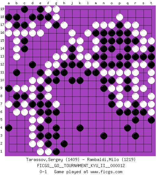 Last move : 0-1 2009 December 17 18:19:9 [Event "FICGS__GO__TOURNAMENT_KYU_II__000012"] [Site "FICGS"] [Date "2009.09.11"] [Round "1"] [Black "Tarassov,Sergey"] [White "Rambaldi,Milo"] [Result "0-1"] [Rating 1 "1409"] [Rating 2 "1219"] 1.q16 d4 2.q4 c16 3.q10 o17 4.q14 l16 5.k4 r6 6.r5 r9 7.q9 r8 8.q6 q7 9.p6 p7 10.o7 p8 11.o8 p9 12.o10 o9 13.s6 p10 14.n9 q11 15.r7 o11 16.n10 r17 17.s13 r12 18.r13 s12 19.t9 t13 20.o15 m14 21.n13 n11 22.m13 l13 23.m11 m12 24.n12 l12 25.n14 m15 26.s10 r10 27.o12 p11 28.s11 s9 29.t14 t8 30.t12 t11 31.f3 p16 32.p15 r16 33.q12 r11 34.p12 q17 35.q15 s15 36.r15 s14 37.p13 e16 38.d7 d10 39.e9 e10 40.f10 f11 41.g11 g12 42.e11 f12 43.h11 f9 44.g10 d9 45.e8 f4 46.e3 d3 47.e4 d6 48.e6 e5 49.f5 d5 50.g4 f6 51.e7 c7 52.c8 d8 53.b7 c6 54.f7 c9 55.b8 b9 56.h12 h13 57.j13 h14 58.j14 j12 59.k12 j11 60.j10 k11 61.l11 k13 62.k10 j15 63.k12 k14 64.n16 n17 65.j12 j16 66.m16 m17 67.o16 e2 68.f2 d2 69.p17 p18 70.n15 k15 71.d12 g13 72.b11 b13 73.c14 b14 74.c15 b15 75.a4 b6 76.c17 d16 77.b17 b16 78.e18 d17 79.d18 g18 80.f18 f17 81.b18 f1 82.g1 e1 83.h2 f19 84.c19 s7 85.r6 t6 86.t5 a17 87.a18 a16 88.r3 t13 89.t7 t10 90.t12 g7 91.g6 t13 92.a9 a7 93.t12 f8 94.f6 t13 95.e19 g19 96.t12 g2 97.g3 t13 98.g17 h17 99.t12 t15 100.t13 r14 101.q13 s16 102.o14 t6 103.p16 t7 104.n3 pass 105.pass pass 0-1 Here are the names of the openings (joseki) played in the four corners : Corner q16 : q16 o17 Hoshi (Hwajeom, Seongjeom, Xingwei`) 4-4 Point. The star or hoshi (4-4) point, emphasizing influence at the potential expense of territory. Ikken Kakari (Hankan Keolch'im, Yi Gua`jiao~, 1-Space Low Approach). White 2 is the standard approach move to the 4-4. Corner q4 : q4 r6 Hoshi (Hwajeom, Seongjeom, Xingwei`) 4-4 Point. The star or hoshi (4-4) point, emphasizing influence at the potential expense of territory. Ikken Kakari (Hankan Keolch'im, Yi Gua`jiao~, 1-Space Low Approach). White 2 is the standard approach move to the 4-4. Corner d4 : d4 f3 Hoshi (Hwajeom, Seongjeom, Xingwei`) 4-4 Point. The star or hoshi (4-4) point, emphasizing influence at the potential expense of territory. Ikken Kakari (Hankan Keolch'im, Yi Gua`jiao~, 1-Space Low Approach). Black 2 is the standard approach move to the 4-4. Player White won this Go (weiqi, baduk) game. Follow this game move after move (download)Keep away from thickness. (Anonymous) Gambling : The sure way of getting nothing from something. (Wilson Mizner)
