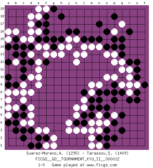 Last move : 1-0 2009 December 24 10:42:10 [Event "FICGS__GO__TOURNAMENT_KYU_II__000012"] [Site "FICGS"] [Date "2009.09.11"] [Round "1"] [Black "Suarez-Moreno,Alejandro"] [White "Tarassov,Sergey"] [Result "1-0"] [Rating 1 "1295"] [Rating 2 "1409"] 1.r16 d4 2.q3 d16 3.c10 e10 4.c6 c8 5.d9 d8 6.d12 e9 7.c14 c15 8.d14 d10 9.c11 e14 10.e15 d15 11.f15 f13 12.h15 b14 13.e13 f14 14.f12 h13 15.g14 g13 16.b13 b12 17.c12 a13 18.c13 e11 19.b15 b16 20.a14 e12 21.c3 c4 22.d3 e3 23.b4 d6 24.q10 o10 25.k4 n4 26.m3 k6 27.o3 j3 28.n7 m4 29.p8 n3 30.n2 l3 31.k14 k12 32.l8 l13 33.m15 m2 34.p2 p5 35.q5 o7 36.o8 m8 37.m7 m9 38.o6 l7 39.o5 p12 40.e17 d17 41.f17 p16 42.q15 o15 43.q13 q12 44.r12 q17 45.n17 n14 46.n15 m14 47.l5 l6 48.m5 j4 49.c5 d5 50.e2 f3 51.f2 g2 52.p18 h14 53.g15 k13 54.o16 k15 55.l15 l14 56.k16 j15 57.j16 j14 58.o14 o13 59.p15 p13 60.q14 o4 61.p4 n5 62.m6 k5 63.p7 e18 64.f18 d18 65.b9 b8 66.a10 a5 67.b5 a6 68.b3 q9 69.p9 r11 70.s12 r10 71.r9 s9 72.q8 r8 73.r7 f1 74.d1 q9 75.s7 p10 76.s11 n1 77.o2 e16 78.f16 f19 79.g19 e19 80.h18 a16 81.s10 q11 82.a4 a7 83.l4 k3 84.o1 m1 85.s8 r9 86.t9 a15 87.b14 c9 88.a12 n9 89.p14 c7 90.c2 b6 91.a9 a8 92.e1 g1 93.n6 m3 94.n8 d13 95.pass 1-0 Here are the names of the openings (joseki) played in the four corners : Corner d4 : d4 c6 Hoshi (Hwajeom, Seongjeom, Xingwei`) 4-4 Point. The star or hoshi (4-4) point, emphasizing influence at the potential expense of territory. Ikken Kakari (Hankan Keolch'im, Yi Gua`jiao~, 1-Space Low Approach). Black 2 is the standard approach move to the 4-4. Corner d16 : d16 d12 Hoshi (Hwajeom, Seongjeom, Xingwei`) 4-4 Point. The star or hoshi (4-4) point, emphasizing influence at the potential expense of territory. Corner q4 : q3 n4 Komoku (Somok, Xiao~mu`) 3-4 Point. The komoku (3-4) point is the traditional corner enclosure move.. Corner q16 : r16 l13 Komoku (Somok, Xiao~mu`) 3-4 Point. The komoku (3-4) point is the traditional corner enclosure move.. Player Black won this Go (weiqi, baduk) game. Follow this game move after move (download)Do not fear furikawari. (Anonymous) Players are not good because they find tactics, it is about the way to find the positions in which those tactics are hidden. (Luc-Olivier Leclerc)
