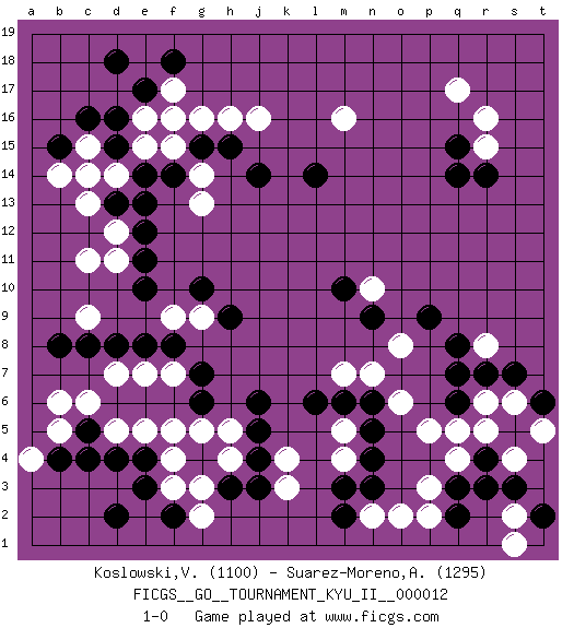 Last move : 1-0 2010 March 29 22:40:41 [Event "FICGS__GO__TOURNAMENT_KYU_II__000012"] [Site "FICGS"] [Date "2009.09.11"] [Round "1"] [Black "Koslowski,Volker"] [White "Suarez-Moreno,Alejandro"] [Result "1-0"] [Rating 1 "1100"] [Rating 2 "1295"] 1.d16 q17 2.d4 q4 3.q15 r15 4.r14 r16 5.q14 r8 6.h9 f3 7.n4 c6 8.p9 m16 9.h3 f5 10.d8 e7 11.q7 k4 12.j6 h5 13.l14 c13 14.e13 d11 15.r4 p5 16.r3 o6 17.j5 h4 18.j4 m5 19.n5 n7 20.q8 m4 21.n3 k3 22.j3 j16 23.m6 m7 24.l6 p2 25.n6 o8 26.m10 r5 27.s5 r6 28.e8 f7 29.r7 s6 30.s7 g9 31.g10 f9 32.t6 s4 33.s3 t5 34.e10 c15 35.c5 b5 36.b4 b6 37.f8 f15 38.e4 f4 39.g7 d7 40.e3 d5 41.c4 a4 42.f2 g2 43.d2 g3 44.q6 q5 45.q3 p3 46.q2 n2 47.m2 o2 48.m3 s2 49.t2 s1 50.b8 c9 51.c8 e5 52.c16 e16 53.d15 d14 54.e17 f17 55.g6 g5 56.e14 e15 57.d13 c14 58.b15 c11 59.d18 g13 60.e11 d12 61.e12 b14 62.f14 g14 63.g15 f16 64.f18 g16 65.h15 h16 66.j14 n10 67.n9 1-0 This go game has been lost on time (started : 2009.09.11 8:23:41) Here are the names of the openings (joseki) played in the four corners : Corner q16 : q17 q15 Komoku (Somok, Xiao~mu`) 3-4 Point. The komoku (3-4) point is the traditional corner enclosure move.. Ikken Takagakari (Hankan Nop'dakeolch'im, Yi Gaogua`jiao~, 1-Space High Approach). The 5-4 approach move has become more popular in modern times, as modern Go emphasizes speed and influence. Corner d16 : d16 c13 Hoshi (Hwajeom, Seongjeom, Xingwei`) 4-4 Point. The star or hoshi (4-4) point, emphasizing influence at the potential expense of territory. Niken Kakari (Dukan Keolch'im, E`r Gua`jiao~, 2-Space Low Approach). Black typically answers by 7-3 or 3-5 (which is not joseki). Player Black won this Go (weiqi, baduk) game. Follow this game move after move (download)If you don't know ladders, don't play go. (Anonymous) Somewhere in the world there is an epigram for every dilemma. (Hendrik Willem van Loon)