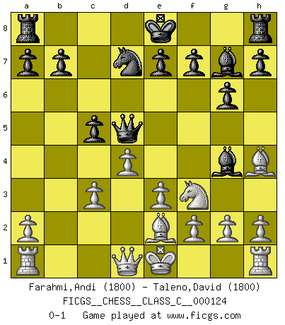 Last move : 0-1 2009 December 10 8:15:30 [Event "FICGS__CHESS__CLASS_C__000124"] [Site "FICGS"] [Date "2009.09.11"] [Round "1"] [White "Farahmi,Andi"] [Black "Taleno,David"] [Result "0-1"] [WhiteElo "1800"] [BlackElo "1800"] 1.d4 Nf6 2.c4 g6 3.Nc3 d5 4.Nf3 Bg7 5.Bg5 Ne4 6.cxd5 Nxc3 7.bxc3 Qxd5 8.e3 Bg4 9.Bh4 Nd7 10.Be2 c5 0-1 This chess game has been lost on time (started : 2009.09.11 22:1:12) King's Indian defense, 3.Nc3 Player Black won this chess game. Follow this game move after move (download)Chess is above all, a fight ! (Emanuel Lasker) Dieses schreckliche Gefühl, dass ich gegen eine Maschine spielte, die niemals Fehler macht, zerschmetterte meinen Widerstand. (Mark Taimanov) El ganar no lo es todo... pero el perder es nada. (Mednis) Le thème de l'attaque double intervient d'une manière ou d'une autre dans l'immense majorité des combinaisons. (Youri Averbakh) Unless in communicating with it one says exactly what one means, trouble is bound to result. (Alan Turing, about computers)