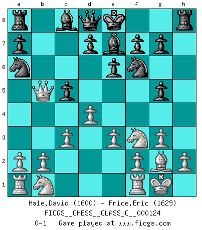 Last move : 0-1 2009 December 5 8:58:36 [Event "FICGS__CHESS__CLASS_C__000124"] [Site "FICGS"] [Date "2009.09.11"] [Round "1"] [White "Hale,David"] [Black "Price,Eric"] [Result "0-1"] [WhiteElo "1600"] [BlackElo "1629"] 1.d4 Nf6 2.Nf3 e6 3.g3 b5 4.Bg2 Bb7 5.O-O c5 6.Bg5 Na6 7.c3 Be7 8.e3 h6 9.Qb3 hxg5 10.Qxb5 Bc8 0-1 Queen's pawn game Kingside Castling by player White (move 5) Player Black won this chess game. Follow this game move after move (download)A bad plan is better than none at all. (Frank Marshall) Was ist der Unterschied zwischen einem Strassenarbeiter und einem Schachspieler? --Der Schachspieler bewegt sich ab und zu. (Anonymous) Botvinnik trató de alejar el misterio referente al Ajedrez, siempre relacionandolo a situaciones de la vida diaria. Solía llamar al Ajedrez un problema inexacto típico, similar a aquellos en que la gente tiene siempre que resolver a cada día. (Garry Kasparov) Un journaliste : 'Vous préférez avoir une dame de plus sur l'échiquier ou au lit ?' Boris Spassky : 'Ca dépend de la position.' 'preceded by its own quotation yields a falsehood' preceded by its own quotation yields a falsehood. (W. V. O. Quine - Set Theory And Its Logic, 1953)