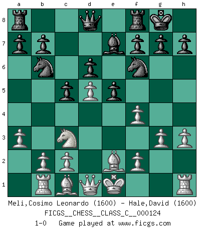 Last move : 1-0 2009 December 10 20:23:32 [Event "FICGS__CHESS__CLASS_C__000124"] [Site "FICGS"] [Date "2009.09.11"] [Round "1"] [White "Meli,Cosimo Leonardo"] [Black "Hale,David"] [Result "1-0"] [WhiteElo "1600"] [BlackElo "1600"] 1.d4 Nf6 2.a3 c5 3.d5 d6 4.Nf3 e5 5.Nc3 Bg4 6.h3 Bxf3 7.exf3 Nbd7 8.f4 Be7 9.Be2 O-O 10.Rb1 Nb6 11.g3 1-0 This chess game has been lost on time (started : 2009.09.11 22:1:12) Queen's pawn game Kingside Castling by player Black (move 9) Player White won this chess game. Follow this game move after move (download)A thorough understanding of the typical mating continuations makes the most complicated sacrificial combinations leading up to them not only not difficult, but almost a matter of course. (Siegbert Tarrasch) Alle Schachspieler sollten auch ein Hobby haben. (Savielly Grigorievitsch Tartakower) El hombre es un frívolo, una creatura engañosa y como un jugador de Ajedrez, se preocupa mas por el proceso de obtener su meta que de la meta por sí misma. (Dostoyevsky) Donnez-moi un Cavalier en 6e et je gagnerais toutes mes parties. (Steinitz) Lottery : A tax on people who are bad at math. (Author unknown)