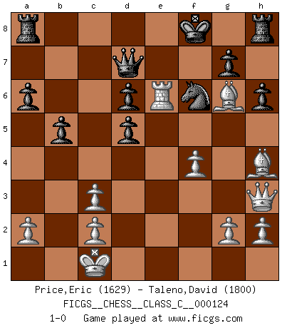Last move : 1-0 2009 November 13 0:42:25 [Event "FICGS__CHESS__CLASS_C__000124"] [Site "FICGS"] [Date "2009.09.11"] [Round "1"] [White "Price,Eric"] [Black "Taleno,David"] [Result "1-0"] [WhiteElo "1629"] [BlackElo "1800"] 1.e4 c5 2.Nf3 d6 3.d4 cxd4 4.Nxd4 Nf6 5.Nc3 a6 6.Bg5 e6 7.f4 Be7 8.Qf3 Qc7 9.O-O-O h6 10.Bh4 Nbd7 11.Bd3 b5 12.e5 Bb7 13.Nxe6 fxe6 14.Bg6+ Kf8 15.exf6 Bxf6 16.Qg3 Bxc3 17.bxc3 Bd5 18.Rxd5 exd5 19.Re1 Nf6 20.Re6 Qd7 21.Qh3 1-0 Sicilian : Najdorf, 7...Be7 Queenside Castling by player White (move 9) Player White won this chess game. Follow this game move after move (download)I know people who have all the will in the world, but still can't play good Chess. (Bobby Fischer) Die Elozahlen sind sehr schlecht für das Schach. Jetzt ist Schach eine Sportindustrie, die darauf zielt Elopunkte zu machen. (Miguel Najdorf) Aquel que toma al Peón de Caballo de la Reina, se pasará la noche a dormir en la calle. (Anónimo) Toutes choses étant égales, c'est la conviction qui gagne. Alliée à une volonté de vaincre, elle sert de détonateur, suscite des idées, disperse les doutes et aide à penser clairement. (Robert Fischer) Real knowledge is to know the extent of one's ignorance. (Confucius)
