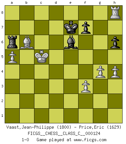 Last move : 1-0 2009 November 14 0:34:54 [Event "FICGS__CHESS__CLASS_C__000124"] [Site "FICGS"] [Date "2009.09.11"] [Round "1"] [White "Vaast,Jean-Philippe"] [Black "Price,Eric"] [Result "1-0"] [WhiteElo "1800"] [BlackElo "1629"] 1.c4 Nf6 2.g3 e5 3.Bg2 c6 4.d4 exd4 5.Qxd4 d5 6.cxd5 cxd5 7.Nf3 Be7 8.Nc3 Nc6 9.Qa4 O-O 10.O-O Bb4 11.Bg5 Bxc3 12.bxc3 h6 13.Bf4 Bd7 14.Rfd1 Qe7 15.Nd4 Ne4 16.Qb3 Rac8 17.Bxe4 Qxe4 18.Qxb7 Bh3 19.f3 Qg6 20.Nxc6 Rxc6 21.Rxd5 Rxc3 22.Qxa7 Rc2 23.Rd2 Re8 24.Re1 Qc6 25.Rxc2 Qxc2 26.Kf2 g5 27.Be3 Be6 28.a4 g4 29.Qc5 Qxc5 30.Bxc5 gxf3 31.exf3 Bd7 32.Ra1 Ra8 33.a5 Bc8 34.Ke3 Ba6 35.Rd1 Kg7 36.Kf4 Bc4 37.Bb6 Re8 38.g4 Ra8 39.Rd6 Ra6 40.Rd8 Kf6 41.h4 Be6 42.Ke4 Kg6 43.Kd4 Kf6 44.Kc5 Ke7 45.Rh8 1-0 English, 1...Nf6 (Anglo-Indian defense) Kingside Castling by player Black (move 9) Kingside Castling by player White (move 10) Player White won this chess game. Follow this game move after move (download)Pawn endings are to Chess what putting is to golf. (Cecil Purdy) Wenn es im Universum noch irgendwo intelligente Lebewesen gibt, dann kennen sie Go. (Emanuel Lasker) Personalmente, yo prefiero mirar hacia el futuro en donde un programa de computadora gane el título mundial de Ajedrez. La humanidad necesita una lección de humildad. (Richard Dawkings) Je ne crois pas en la psychologie, je crois aux bons coups. (Robert Fischer) We need strong personalities and only one world champion to attract sponsors. (Anatoly Karpov)