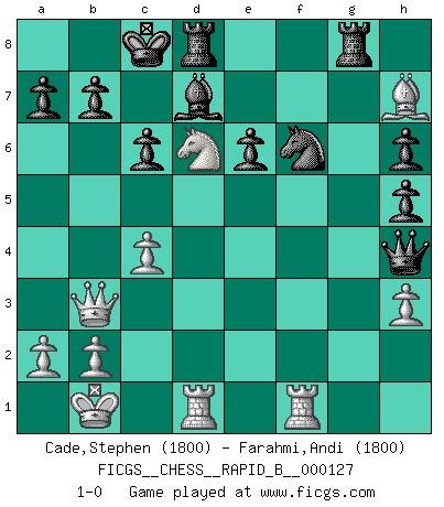 Last move : 1-0 2009 November 3 3:29:39 [Event "FICGS__CHESS__RAPID_B__000127"] [Site "FICGS"] [Date "2009.09.12"] [Round "1"] [White "Cade,Stephen"] [Black "Farahmi,Andi"] [Result "1-0"] [WhiteElo "1800"] [BlackElo "1800"] 1.d4 d5 2.c4 c6 3.Nc3 Nf6 4.e3 e6 5.Nf3 Nbd7 6.Qc2 Bd6 7.g4 Nxg4 8.Rg1 h5 9.h3 Qf6 10.Be2 Nh6 11.e4 dxe4 12.Nxe4 Qe7 13.Nxd6+ Qxd6 14.Bxh6 gxh6 15.O-O-O Nf6 16.Ne5 Bd7 17.Qb3 O-O-O 18.Nxf7 Qf4+ 19.Kb1 Qxf2 20.Bd3 Rhg8 21.Rgf1 Qxd4 22.Bh7 Qh4 23.Nd6+ 1-0 QGD Slav defense Queenside Castling by player White (move 15) Queenside Castling by player Black (move 17) Player White won this chess game. Follow this game move after move (download)In Chess, as it is played by masters, chance is practically eliminated. (Emanuel Lasker) In Buenos Aires ist es nicht mein vorrangiges Ziel ein starkes Turnier zu organisieren, sondern ein Turnier für Gentlemen. Ich würde nie Kamsky einladen. Ich mag keine Probleme. (Miguel Najdorf) No nos podemos resistir a la fascinación de un sacrificio ya que la pasión por los sacrificios es parte de la naturaleza de un jugador de Ajedrez. (Rudolf Spielman) Les échecs sont un jeu terrible. Si vous n'avez pas le centre, votre adversaire a une position plus libre. Par contre, si vous avez le centre, alors vous avez vraiment quelque chose pour laquelle vous inquiéter ! (Siegbert Tarrasch) Animated gif is worth one mega-word. (Unknown)