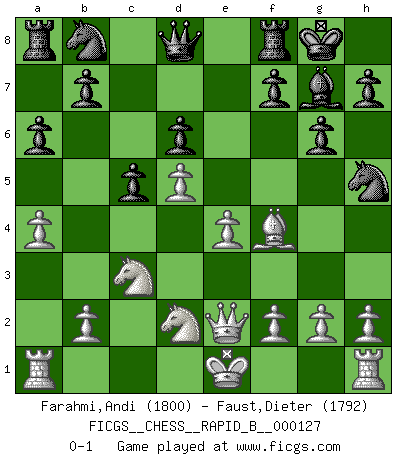 Last move : 0-1 2009 November 29 21:1:15 [Event "FICGS__CHESS__RAPID_B__000127"] [Site "FICGS"] [Date "2009.09.12"] [Round "1"] [White "Farahmi,Andi"] [Black "Faust,Dieter"] [Result "0-1"] [WhiteElo "1800"] [BlackElo "1792"] 1.d4 Nf6 2.c4 c5 3.d5 e6 4.Nc3 exd5 5.cxd5 d6 6.e4 g6 7.Be2 Bg7 8.Nf3 O-O 9.Bf4 a6 10.a4 Bg4 11.Nd2 Bxe2 12.Qxe2 Nh5 0-1 This chess game has been lost on time (started : 2009.09.12 14:25:46) Benoni : 6.e4 Kingside Castling by player Black (move 8) Player Black won this chess game. Follow this game move after move (download)Fischer Chess play was always razor-sharp, rational and brilliant. One of the best ever. (Dave Regis) Ich las kürzlich ein Buch von Nietzsche. Er sagte Religion verdumme nur die Menschen. Ich stimme zu. (Robert James Fischer) Un mal plan es mejor que no tener ningún plan. (Frank Marshall) Tous ces prétendus hommes politiques sont les pions, les Cavaliers, les Tours ou les Fous d'une partie d'échecs qui se jouera tant qu'un hasard ne renversera pas l'échiquier. (Honoré de Balzac) Big Chess is a place for big hallucinations. (Thibault de Vassal)