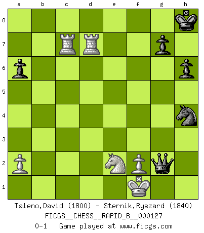 Last move : 0-1 2009 November 13 0:42:59 [Event "FICGS__CHESS__RAPID_B__000127"] [Site "FICGS"] [Date "2009.09.12"] [Round "1"] [White "Taleno,David"] [Black "Sternik,Ryszard"] [Result "0-1"] [WhiteElo "1800"] [BlackElo "1840"] 1.d4 Nf6 2.c4 e6 3.Nc3 d5 4.Bg5 Be7 5.Nf3 h6 6.Bh4 O-O 7.e3 Ne4 8.Bxe7 Qxe7 9.cxd5 Nxc3 10.bxc3 exd5 11.Bd3 c5 12.Qb1 Nc6 13.O-O Bg4 14.Nd2 b6 15.Bh7+ Kh8 16.Bf5 Bxf5 17.Qxf5 Qe6 18.Qf3 f5 19.Rac1 Rae8 20.c4 Rd8 21.dxc5 Ne5 22.Qe2 bxc5 23.cxd5 Rxd5 24.Nb3 Qd6 25.Rfd1 Nd3 26.Qf3 Rd8 27.Rc2 Qg6 28.Nc1 Ne5 29.Qxd5 Rxd5 30.Rxd5 f4 31.R2xc5 Nf3+ 32.Kf1 Nxh2+ 33.Kg1 Nf3+ 34.Kf1 Nh4 35.exf4 Qxg2+ 36.Ke2 Qe4+ 37.Kf1 Qxf4 38.Rd7 a6 39.R5c7 Qf3 40.Ne2 Qg2+ 0-1 Queen's pawn game Kingside Castling by player Black (move 6) Kingside Castling by player White (move 13) Player Black won this chess game. Follow this game move after move (download)Chess problems demand from the composer the same virtues that characterize all worthwhile art: originality, invention, conciseness, harmony, complexity, and splendid insincerity. (Vladimir Nabokov) Zu meiner Zeit war ein 20 jähriger ein junger Spieler, heute ist er ein Veteran. (Garry Kasparov) El Ajedrez, como cualquier otra actividad creativa, puede existir solo a través de méritos combinados de aquellos que tienen talento creativo y de aquellos que tienen la habilidad de organizar un trabajo creativo. (Mikhail Botvinnik) Ne tendez aucun piège pour le plaisir ! Ne jouez rien dans l'espoir que l'adversaire réagisse de façon stupide ! Prenez toujours pour acquis que l'adversaire va trouver le meilleur coup ! Ne jouez jamais de coup dans l'espoir que l'adversaire ne voie pas la menace ! Chacun de vos coups doit améliorer la position d'une façon ou d'une autre. A proverb is a short sentence based on long experience. (Miguel de Cervantes)