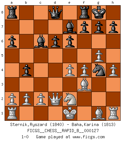 Last move : 1-0 2009 December 5 8:58:36 [Event "FICGS__CHESS__RAPID_B__000127"] [Site "FICGS"] [Date "2009.09.12"] [Round "1"] [White "Sternik,Ryszard"] [Black "Baha,Karina"] [Result "1-0"] [WhiteElo "1840"] [BlackElo "1813"] 1.e4 c5 2.Nc3 d6 3.Nf3 Nf6 4.d4 cxd4 5.Nxd4 a6 6.Be3 e6 7.f3 b5 8.g4 Be7 9.Qd2 O-O 10.g5 Nfd7 11.h4 Ne5 12.f4 Ng4 13.Bg1 Bb7 14.Bg2 b4 15.Nce2 Nc6 16.Nxc6 Bxc6 17.Bf3 1-0 This chess game has been lost on time (started : 2009.09.12 14:25:46) Sicilian : Closed Kingside Castling by player Black (move 9) Player White won this chess game. Follow this game move after move (download)Chess is a more highly symbolic game, but the aggressions are therefore even more frankly represented in the play. It probably began as a war game; that is, the representation of a miniature battle between the forces of two kingdoms. (Karl Meninger) Vielleicht wirkt die Aura früherer Spieler glanzvoller als die der heutigen Spieler, aber das liegt daran, dass man kein Programm wie Fritz hatte, das einem all die Löcher in ihren Partien zeigt. (Vladimir Kramnik) El muchacho (en ese entonces un niño de 12 años llamado Anatoly Karpov) no tiene ni idea de lo que es el Ajedrez y no hay futuro en absoluto para el en esta profesión. (Mikhail Botvinnik) C'est la seule position que je connaisse où les deux camps sont mals. Propos prêtés à V. Anand. Pushing plastic is for the many, pushing virtual pieces is for the fewer, pushing wood is for the very few. (Normajean Yates)