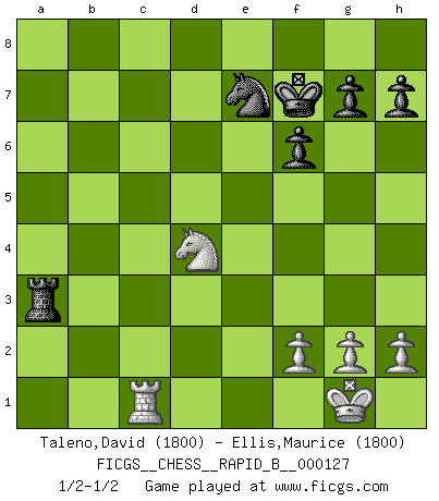 Last move : 1/2-1/2 2009 October 24 21:28:23 [Event "FICGS__CHESS__RAPID_B__000127"] [Site "FICGS"] [Date "2009.09.12"] [Round "1"] [White "Taleno,David"] [Black "Ellis,Maurice"] [Result "1/2-1/2"] [WhiteElo "1800"] [BlackElo "1800"] 1.e4 e6 2.d4 d5 3.exd5 exd5 4.Nf3 Bb4+ 5.c3 Bd6 6.Bb5+ Bd7 7.Bxd7+ Qxd7 8.O-O Nc6 9.Re1+ Nge7 10.b4 O-O 11.b5 Na5 12.Na3 f6 13.Qa4 b6 14.c4 a6 15.c5 axb5 16.Qxb5 c6 17.Qb4 bxc5 18.dxc5 Rfb8 19.Qc3 Bc7 20.Be3 Nb7 21.Nc2 Ba5 22.Nb4 Nd6 23.a3 Ne4 24.Qb3 Rb5 25.Qd3 Nf5 26.Nd2 Nxc5 27.Bxc5 Rxc5 28.Nb3 Rc4 29.Rec1 Rxc1+ 30.Rxc1 Ne7 31.Nxa5 Rxa5 32.Qe3 d4 33.Qd3 c5 34.Qc4+ Kf8 35.Nd3 Rxa3 36.Nxc5 Qd5 37.Qxd4 Qxd4 38.Ne6+ Kf7 39.Nxd4 1/2-1/2 French : Exchange variation Kingside Castling by player White (move 8) Kingside Castling by player Black (move 10) This chess game ended in a draw. Follow this game move after move (download)When you absolutely don't know what to do anymore, it is time to panic. (John van der Wiel) Der Vorposten provoziert a) eine Basis für neue Angriffe und b) eine Schwächung der gegnerischen Widerstandskraft in der fraglichen Linie. (Aaron Nimzowitsch) Con el fin de mejorar tu juego, debes de estudiar los finales antes que todo, ya que mientras que los finales pueden ser estudiados y dominados por sí mismos, el juegomedio y la apertura deben de ser estudiados en relación con los finales. (José Raúl Capablanca) Je ne crois pas en la psychologie, je crois aux bons coups. (Robert Fischer) I'll be back. (Arnold Schwarzenegger)