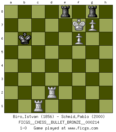 Last move : 1-0 2009 September 14 22:7:15 [Event "FICGS__CHESS__BULLET_BRONZE__000214"] [Site "FICGS"] [Date "2009.09.14"] [Round "1"] [White "Biro,Istvan"] [Black "Schmid,Pablo"] [Result "1-0"] [WhiteElo "1856"] [BlackElo "2000"] 1.d4 Nf6 2.Bg5 Ne4 3.Bf4 c5 4.f3 Qa5+ 5.c3 Nf6 6.Nd2 cxd4 7.Nb3 Qb6 8.Qxd4 Nc6 9.Qxb6 axb6 10.Nd4 e5 11.Nxc6 exf4 12.Nd4 Bd6 13.Nf5 Bc5 14.Nxg7+ Kf8 15.Nf5 d6 16.Nd4 Nd5 17.a3 Kg7 18.g3 Re8 19.Rc1 fxg3 20.hxg3 Ne3 21.Nh3 Nc4 22.Rb1 Bxd4 23.cxd4 Re3 24.Nf4 Rb3 25.Nh5+ Kf8 26.Nf6 Nxb2 27.Rc1 Bf5 28.Kf2 Bg6 29.Nxh7+ Kg7 30.Ng5 R8xa3 31.Kg2 Ra5 32.Nh3 Ra4 33.Rc7 Rxd4 34.Nf4 Rd2 35.Nxg6 Kxg6 36.Rh8 Nd3 37.Rg8+ Kf6 38.Rf8 Ne5 39.f4 Kg7 40.Rb8 Ng4 41.R8xb7 Nh6 42.Kf2 b5 43.Bg2 b4 44.Bf3 Rd4 45.Bh5 Kf6 46.Re7 Rb1 47.Bxf7 Nxf7 48.Rxf7+ Ke6 49.g4 Kd5 50.g5 R4d1 51.Kf3 Re1 52.g6 Kd4 53.Rfd7 Rf1+ 54.Kg4 Rf2 55.Rxd6+ Kc5 56.Re6 b3 57.Reb6 Rxe2 58.Rxb3 Rg2+ 59.Kf5 Ra1 60.R3b5+ Kc4 61.Kf6 Ra6+ 62.R5b6 Ra8 63.g7 Rg8 64.f5 Kd4 65.Rb2 Rg3 66.Rd2+ Kc3 67.R2d7 Rg1 68.Ke6 Re1+ 69.Kf7 R1e8 70.f6 Kc4 71.Rb1 Kc5 72.Rc1+ Kb6 73.Rd2 1-0 Trompowsky attack (Ruth, Opovcensky Opening) 10 pieces endgame at move 55 : White KRRPPP , Black KRRP WHITE : King + 2 Rooks 3 Pawns BLACK : King + 2 Rooks 1 Pawn 9 pieces endgame at move 57 : White KRRPP , Black KRRP WHITE : King + 2 Rooks 2 Pawns BLACK : King + 2 Rooks 1 Pawn 8 pieces endgame at move 58 : White KRRPP , Black KRR WHITE : King + 2 Rooks 2 Pawns BLACK : King + 2 Rooks Player White won this chess game. Follow this game move after move (download)Dazzling combinations are for the many, shifting wood is for the few. (Georg Kieninger) Schach ist das Spiel, das die Verrückten gesund hält. (Albert Einstein) Las Aperturas te enseñan aperturas. ¡Los Finales te enseñan Ajedrez!. (Stephan Gerzadowicz) Le plus grand jeu de l'esprit jamais inventé, plus vous l'apprenez, plus vous y prenez du plaisir. (Garry Kasparov) At work, the authority of a person is inversely proportional to the number of pens that person is carrying. (Dan Rotaru)