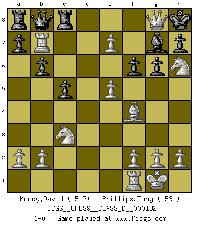 Last move : 1-0 2009 October 11 21:24:12 [Event "FICGS__CHESS__CLASS_D__000132"] [Site "FICGS"] [Date "2009.09.16"] [Round "1"] [White "Moody,David"] [Black "Phillips,Tony"] [Result "1-0"] [WhiteElo "1517"] [BlackElo "1591"] 1.e4 g6 2.Nf3 Bg7 3.d4 Nf6 4.e5 Nd5 5.c4 O-O 6.cxd5 d6 7.Nc3 dxe5 8.dxe5 Bf5 9.Bd3 c6 10.Bxf5 Nd7 11.Bxd7 Qxd7 12.O-O c5 13.Bf4 b6 14.Qb3 e6 15.Rad1 Kh8 16.Ng5 f6 17.dxe6 Qe7 18.Nf7+ Kg8 19.Rd7 Qe8 20.Nd6 Qb8 21.e7 Kh8 22.Rb7 Rc8 23.Nf7+ Kg8 24.Nh6+ Kh8 25.Qg8+ 1-0 Robatsch (Modern) defense Kingside Castling by player Black (move 5) Kingside Castling by player White (move 12) Player White won this chess game. Follow this game move after move (download)One bad move nullifies forty good ones. (Horowitz) Wer der Ansicht ist, daß alle Schachspieler verrückt sind, wird durch Studium des Lebens von Emil Josef Diemer nicht auf andere Gedanken kommen. (Hans Ree) Un buen sacrificio es aquel que aunque no sea necesariamente sólido, deja a tu oponente aturdido y confuso. (Rudolph Spielmann) Les échecs, c'est la lutte contre l'erreur. (Johannes Zukertort) As a goal marker shodan is important. As a destination it is a poor place to stop. (Thomas Tamayo)