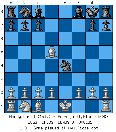 Last move : 1-0 2009 October 9 2:11:12 [Event "FICGS__CHESS__CLASS_D__000132"] [Site "FICGS"] [Date "2009.09.16"] [Round "1"] [White "Moody,David"] [Black "Pernigotti,Nico"] [Result "1-0"] [WhiteElo "1517"] [BlackElo "1600"] 1.e4 e5 2.Nf3 Nf6 3.Nxe5 d6 4.Nxf7 Kxf7 5.Bc4+ d5 6.Bb3 Nxe4 7.Qh5+ Kg8 8.Qxd5+ Qxd5 9.Bxd5+ 1-0 Petrov : Cochrane gambit Player White won this chess game. Follow this game move after move (download)Bobby Fischer is the greatest Chess genius of all time ! (Alexander Kotov) Moralische Siege zählen nicht. (Savielly Grigorievitsch Tartakower) Tu cuerpo tiene que estar en óptima condición. Tu Ajedrez se deteriora como lo hace tu cuerpo. No puedes separar la mente y el cuerpo. (Bobby Fischer) Les sacrifices démontrent seulement que quelqu'un a gaffé. (Savielly Tartacover) Fame, I have already. Now I need the money. (an elderly Steinitz)
