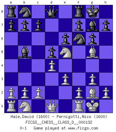Last move : 0-1 2009 November 9 20:27:33 [Event "FICGS__CHESS__CLASS_D__000132"] [Site "FICGS"] [Date "2009.09.16"] [Round "1"] [White "Hale,David"] [Black "Pernigotti,Nico"] [Result "0-1"] [WhiteElo "1600"] [BlackElo "1600"] 1.d4 Nf6 2.g3 g6 3.Bg2 Bg7 4.Nf3 e6 5.O-O O-O 6.Bg5 d5 7.e3 Bd7 8.Ne5 Bb5 0-1 This chess game has been lost on time (started : 2009.09.16 10:5:21) Queen's pawn game Kingside Castling by player White (move 5) Kingside Castling by player Black (move 5) Player Black won this chess game. Follow this game move after move (download)For surely of all the drugs in the world, Chess must be the most permanently pleasurable. (Assiac) Die westlichen Werte sind eine Sprache, welche die Putin-Administration nicht versteht. (Garry Kasparov) En el Ajedrez, tal como en la vida, las bendiciones de hoy pueden ser el veneno del mañana. (Assaic) Les Echecs mettent en conflit, non pas deux intelligences, mais deux volontés. (Lasker) Computers are like Old Testament gods; lots of rules and no mercy. (Joseph Campbell)