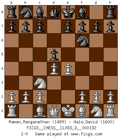 Last move : 1-0 2009 November 29 8:58:20 [Event "FICGS__CHESS__CLASS_D__000132"] [Site "FICGS"] [Date "2009.09.16"] [Round "1"] [White "Raman,Ranganathan"] [Black "Hale,David"] [Result "1-0"] [WhiteElo "1489"] [BlackElo "1600"] 1.Nc3 Nf6 2.e4 d5 3.d4 1-0 This chess game has been lost on time (started : 2009.09.16 10:5:21) Dunst (Sleipner, Heinrichsen) Opening Player White won this chess game. Follow this game move after move (download)The most powerful weapon in Chess is to have the next move. (David Bronstein) Ja, ich habe einmal eine Blitzpartie gespielt, es war in einem Zug, 1929. --im Interview 1989 (Mikhail Moiseyevich Botvinik) Yo no creo en la psicología. Yo creo en las buenas movidas. (Bobby Fischer) Même si vous avez un bon coup à faire, regardez toujours s'il n'y en a pas un qui lui soit préférable. (Pedro Damiano) Pushing plastic is for the many, pushing virtual pieces is for the fewer, pushing wood is for the very few. (Normajean Yates)