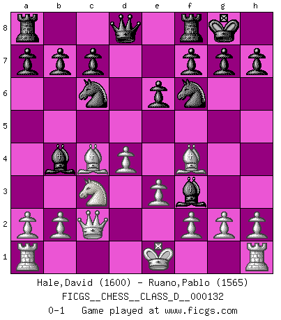 Last move : 0-1 2009 November 6 20:19:41 [Event "FICGS__CHESS__CLASS_D__000132"] [Site "FICGS"] [Date "2009.09.16"] [Round "1"] [White "Hale,David"] [Black "Ruano,Pablo"] [Result "0-1"] [WhiteElo "1600"] [BlackElo "1565"] 1.d4 Nf6 2.Nf3 d5 3.Bf4 Nc6 4.e3 Bg4 5.Be2 e6 6.c4 Bb4+ 7.Nc3 O-O 8.Qc2 dxc4 9.Bxc4 Bxf3 0-1 This chess game has been lost on time (started : 2009.09.16 10:5:21) Queen's pawn game Kingside Castling by player Black (move 7) Player Black won this chess game. Follow this game move after move (download)For me, Chess is life and every game is like a new life. Every Chess player gets to live many lives in one lifetime. (Eduard Gufeld) Ich verstehe Aljechins Kombinationen ganz gut; aber woher er diese Angriffschancen bekommt und wie er die Eröffnung behandelt das ist für mich ein Buch mit sieben Siegeln. (Rudolf Spielmann) Me gusta decir que Bobby Fischer fue el mejor jugador que jamás haya existido. Pero lo que hizo de Fischer un genio, fue su habilidad de mezclar una frescura y pragmatismo Americano con ideas Rusas acerca de la estrategia. (Bruce Pandolfini) Le plus grand jeu de l'esprit jamais inventé, plus vous l'apprenez, plus vous y prenez du plaisir. (Garry Kasparov) A shortcut is the longest distance between two points. (Don Groves)