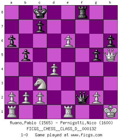 Last move : 1-0 2009 November 18 3:15:57 [Event "FICGS__CHESS__CLASS_D__000132"] [Site "FICGS"] [Date "2009.09.16"] [Round "1"] [White "Ruano,Pablo"] [Black "Pernigotti,Nico"] [Result "1-0"] [WhiteElo "1565"] [BlackElo "1600"] 1.d4 d5 2.Nf3 Nf6 3.Nc3 Nc6 4.e3 Bg4 5.Bb5 Qd7 6.O-O O-O-O 7.h3 a6 8.Bxc6 Qxc6 9.hxg4 e6 10.g5 Be7 11.gxf6 Bxf6 12.Re1 h6 13.e4 Rde8 14.Bf4 g5 15.Be5 Bxe5 16.Nxe5 Qd6 17.Nxf7 Qf4 18.Nxh8 Rxh8 19.exd5 Rf8 20.Qh5 Qxf2+ 21.Kh1 b5 22.dxe6 1-0 Queen's pawn game Kingside Castling by player White (move 6) Queenside Castling by player Black (move 6) Player White won this chess game. Follow this game move after move (download)A Chess game is divided into three stages: the first, when you hope you have the advantage, the second when you believe you have an advantage, and the third... when you know you're going to lose ! (Savielly Tartakower) Konzentriere dich auf materielle Gewinne. Nimm, was dir dein Gegner gibt, ausser es gibt einen guten Grund der dagegenspricht. (Robert James Fischer) Morphy probablemente fue el genio más grande de todos. (Bobby Fischer) L'attaque fait le spectacle, la défense gagne les matchs. (Dicton footballistique) The arrogant army will lose certainly the battle. (Chinese proverb)