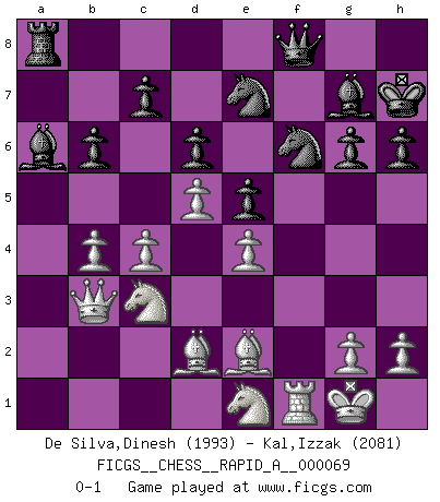 Last move : 0-1 2009 December 9 7:31:57 [Event "FICGS__CHESS__RAPID_A__000069"] [Site "FICGS"] [Date "2009.09.17"] [Round "1"] [White "De Silva,Dinesh"] [Black "Kal,Izzak"] [Result "0-1"] [WhiteElo "1993"] [BlackElo "2081"] 1.d4 Nf6 2.c4 g6 3.Nc3 Bg7 4.e4 d6 5.Nf3 O-O 6.Be2 e5 7.O-O Nc6 8.d5 Ne7 9.Ne1 Nd7 10.Be3 f5 11.f3 b6 12.b4 a5 13.a3 Ba6 14.Rc1 axb4 15.axb4 Qe8 16.Qb3 fxe4 17.fxe4 Rxf1+ 18.Bxf1 Nf6 19.Be2 Qf8 20.Nf3 Ng4 21.Bd2 h6 22.Rf1 Nf6 23.Ne1 Kh7 0-1 King's Indian : Orthodox, Aronin-Taimanov variation (Yugoslav attack / Mar del Plata variation) Kingside Castling by player Black (move 5) Kingside Castling by player White (move 7) Player Black won this chess game. Follow this game move after move (download)Personally, I rather look forward to a computer program winning the world Chess Championship. Humanity needs a lesson in humility. (Richard Dawkings) Unter Putin wird alles Geld aus Russland wie von einem Staubsauger nach Moskau umgeleitet, das ist wie ein schwarzes Loch. (Garry Kasparov) Juega la Apertura como un libro, el Juego Medio como un mago y los Finales como una máquina. (Spielmann) Celui qui prend des risques peut perdre, celui qui n'en prend pas perd toujours. (Xavier Tartacover) Even the best needles are not sharp at both ends. (Chinese proverb)