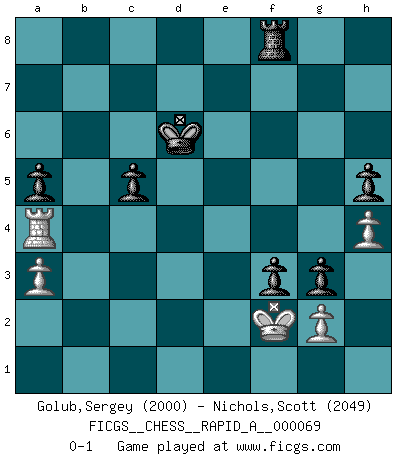Last move : 0-1 2009 December 9 2:5:22 [Event "FICGS__CHESS__RAPID_A__000069"] [Site "FICGS"] [Date "2009.09.17"] [Round "1"] [White "Golub,Sergey"] [Black "Nichols,Scott"] [Result "0-1"] [WhiteElo "2000"] [BlackElo "2049"] 1.d4 d5 2.c4 c6 3.Nf3 Nf6 4.Nc3 e6 5.Bg5 h6 6.Bh4 dxc4 7.e4 g5 8.Bg3 b5 9.Ne5 h5 10.h4 g4 11.Be2 b4 12.Na4 Nxe4 13.Bxc4 Nxg3 14.fxg3 Bg7 15.Nc5 Bxe5 16.dxe5 Qxd1+ 17.Rxd1 Nd7 18.Nxd7 Bxd7 19.Rf1 a5 20.Rf4 Ke7 21.Rd6 Rhd8 22.Ke2 Be8 23.Rfd4 Rxd6 24.exd6+ Kd7 25.Ke3 e5 26.Rd2 f5 27.Bd3 Bg6 28.a3 bxa3 29.bxa3 Rf8 30.Bc2 f4+ 31.gxf4 exf4+ 32.Ke2 Bxc2 33.Rxc2 Kxd6 34.Rc4 f3+ 35.Kf2 c5 36.Ra4 g3+ 0-1 QGD Slav : 4.Nc3 Player Black won this chess game. Follow this game move after move (download)Even the laziest King flees wildly in the face of a double check ! (Aaron Nimzowitsch) Je älter ich werde, um so mehr schätze ich die Bauern. (Paul Keres) La señal de un Gran Maestro es su habilidad de ganar una partida rápidamente y sin dolor. (Irving Chernev) Ce n'est pas pour s'amuser qu'il joue aux échecs : il célèbre un culte. (Vladimir Nabokov) You can only get smarter by playing a smarter opponent. (Revolver, movie)